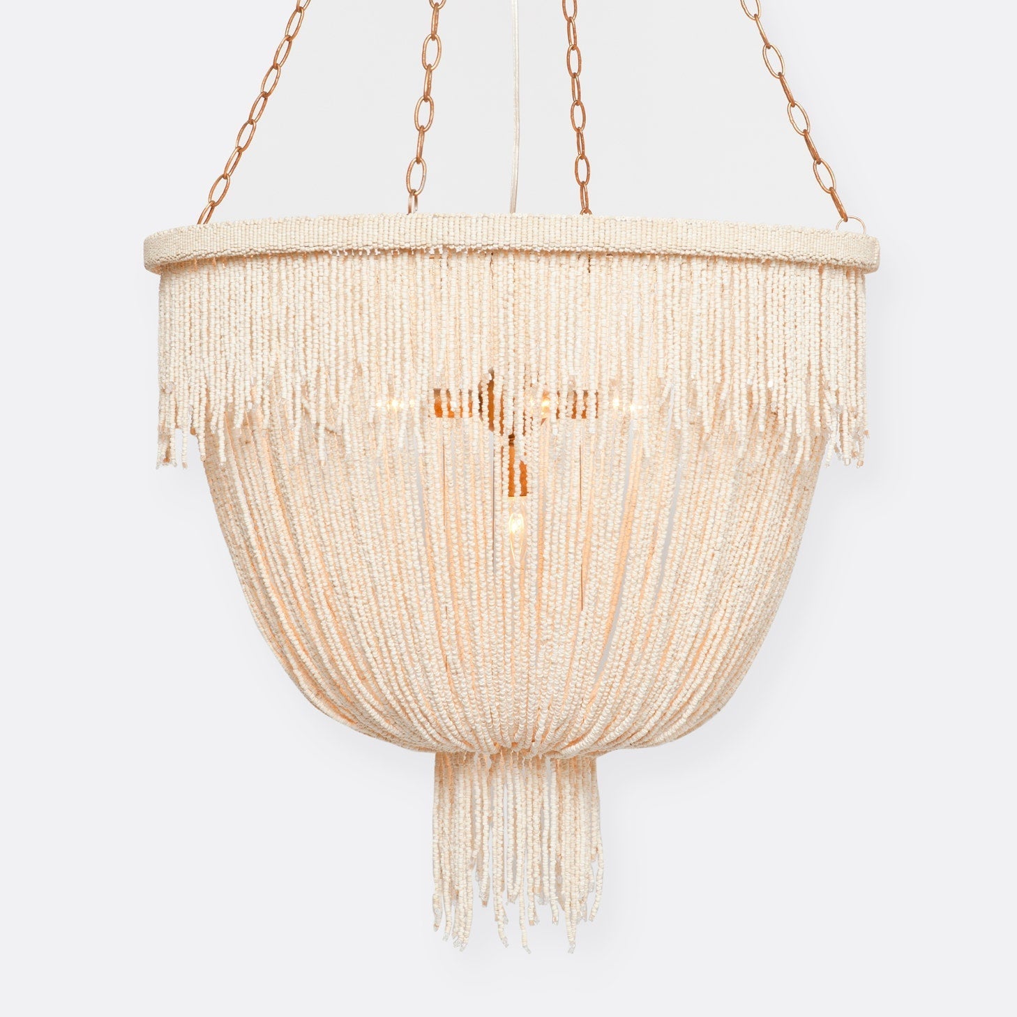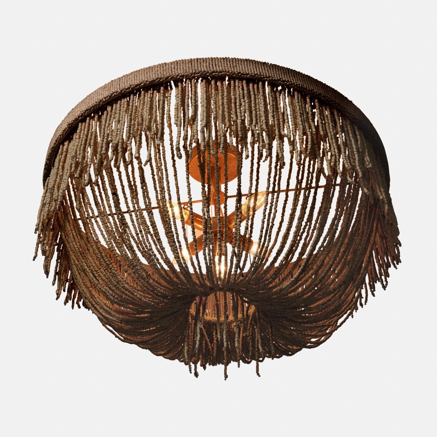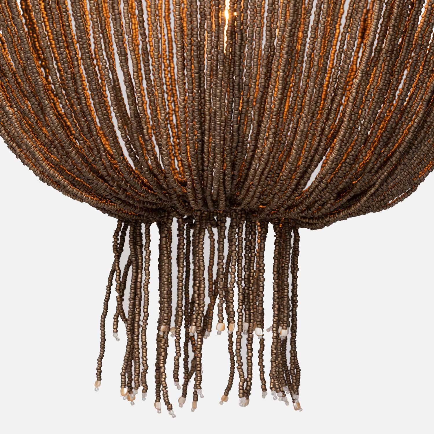 - Loops of coco beads, in a flirty, draped silhouette, meet in a tassel of swaying fringe.