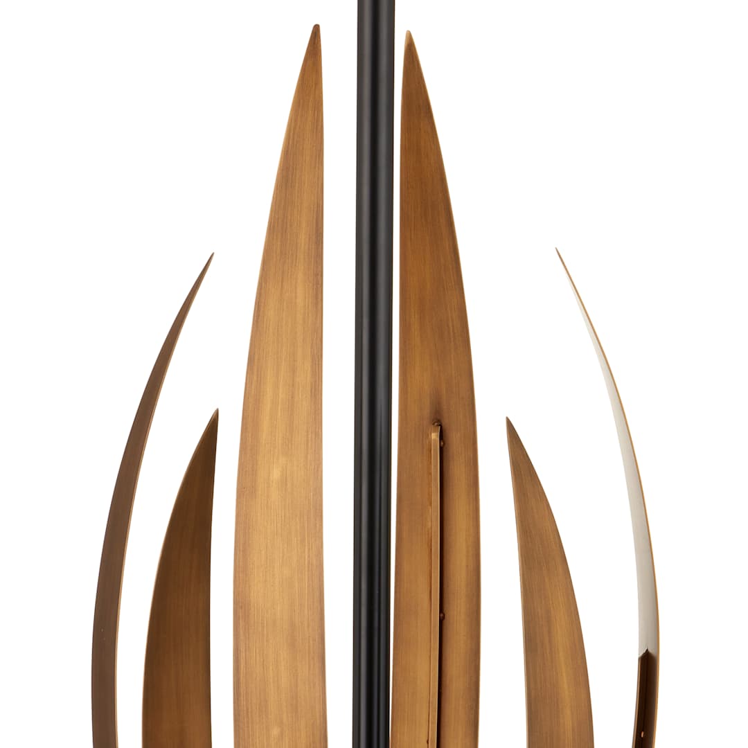 Inspired by his years of living in Florida in proximity to the Everglades, Ian Thornton designed the Neilos Floor Lamp from metal in a mix of antique brass and oil-rubbed bronze finishes. The open-shaped base is fitted with flowing fronds that arc around the thin stem to make this a very graceful nature-inspired design. The gold floor lamp is topped with an off-white linen shade.
