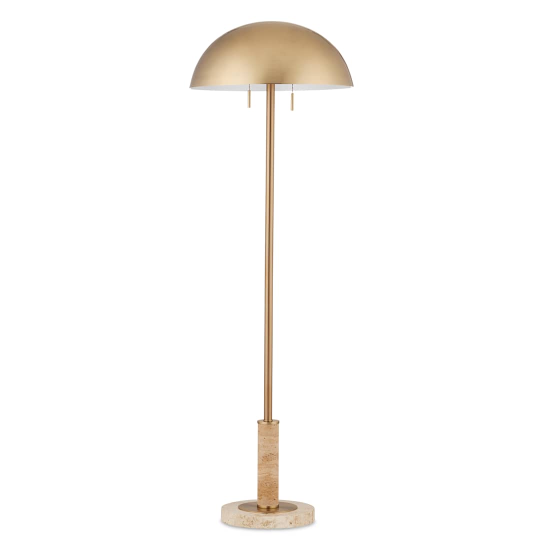 Aimee Kurzner designed the Miles Floor Lamp; the travertine lamp inspired by other pieces with the same name. The mid-century modern vibe is enhanced by the simple shapes of the lamp's base and body, and the domed brass shade that caps it. Because this beige lamp is made of natural stone, texture and color may vary from lamp to lamp.