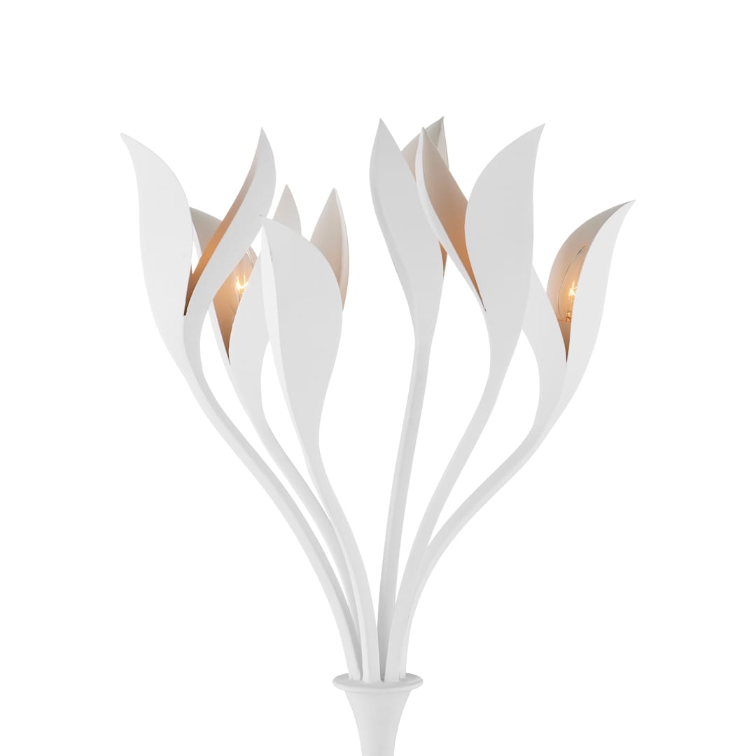 The big, beautiful blossoms of the Snowflower Floor Lamp and the body they flow up from are made of wrought iron in a gesso white finish. Unfolding toward the ceiling, the undulant petals direct the light upward. The pale finish that flows into the interiors of the blooms turns warm when the bulbs illuminate it. The white floor lamp with its wild botanical personality has a foot switch for ease of turning it off and on.