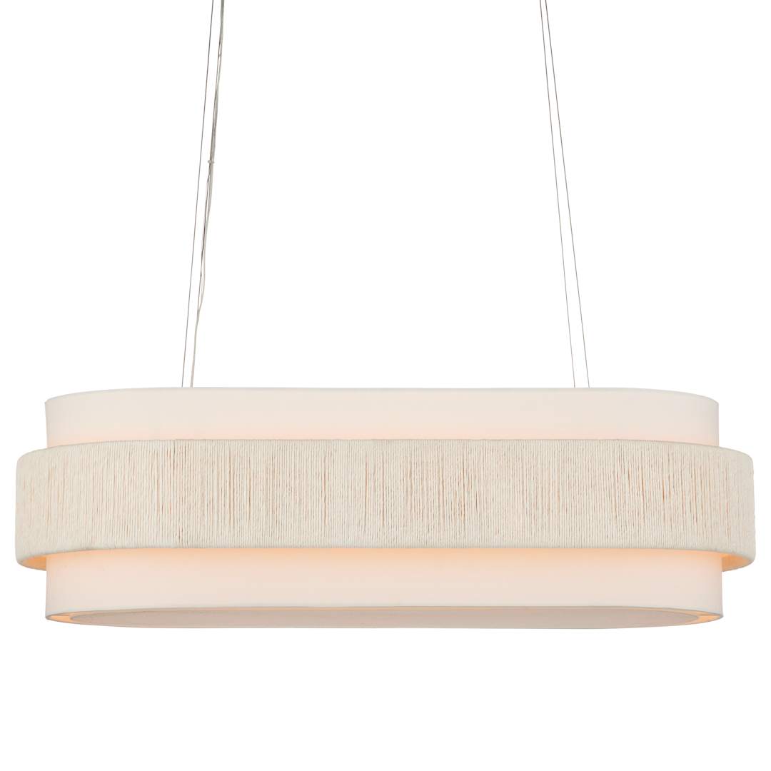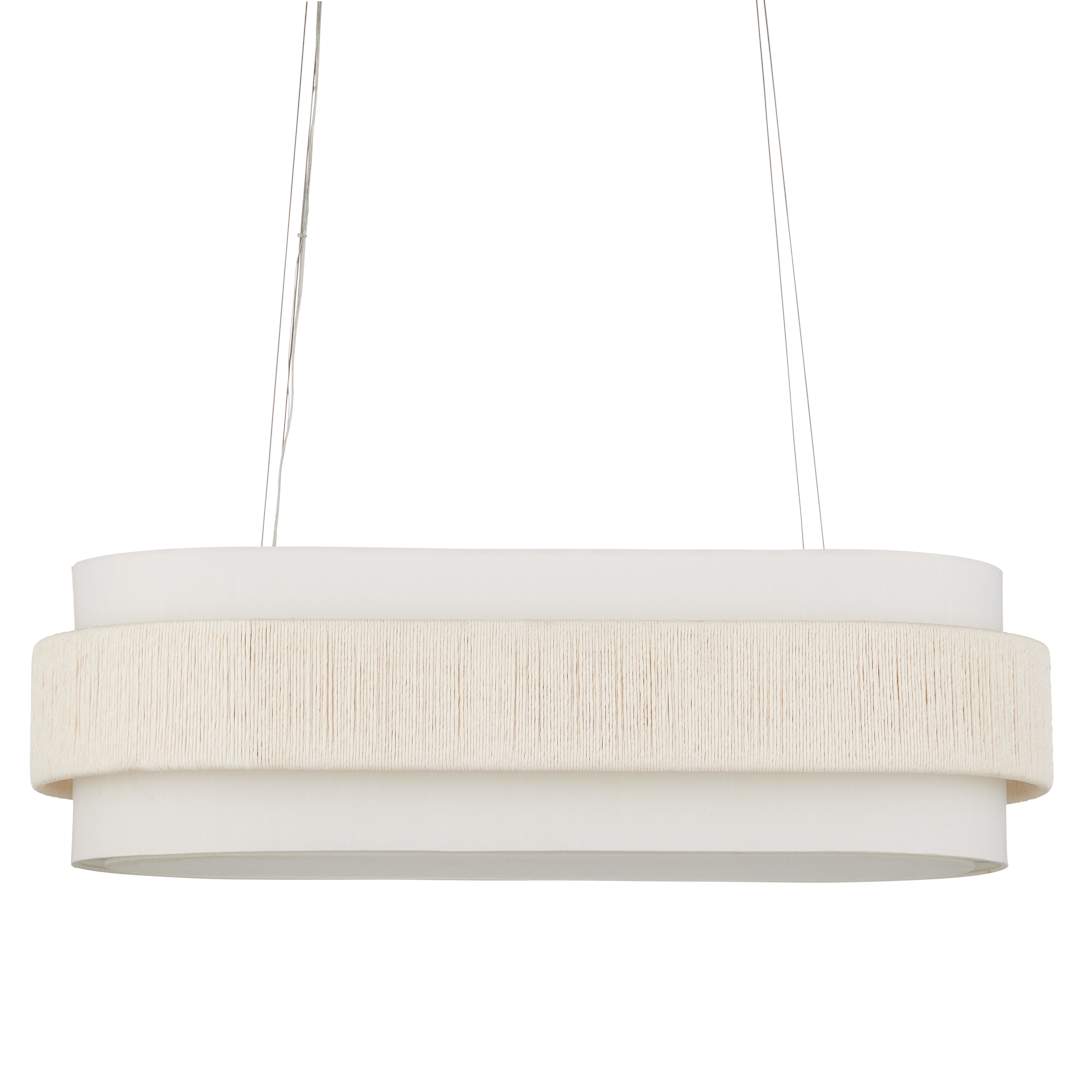 With a band made from recycled paper that has been twisted like braided hair, the Monreale Oval Chandelier has an ultra-contemporary cleanness to its design. The paper, which is painted white, is wrapped around the middle of an off-white shantung shade. The canopy is finished in a Sugar White that contributes to the lightness of this white chandelier. The bottom of the shade is fitted with a diffuser to soften the glow.