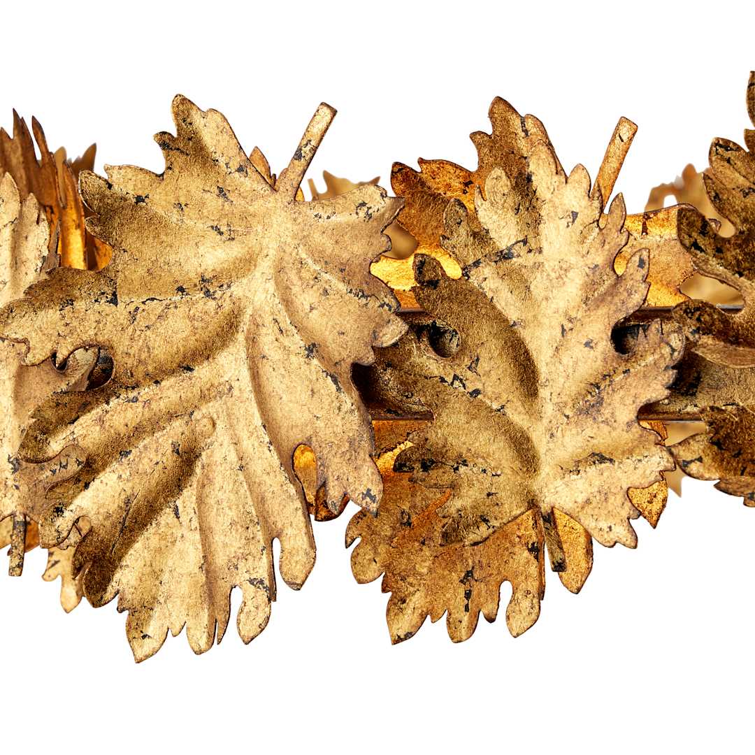 The English Oak Chandelier, designed by Clarence Mallari, is a nature-inspired design with a whimsical profile. Made of wrought iron in a gold leaf finish, the leaves are cut and pressed into life-like shapes. Mallari was inspired by the autumn leaves that fall each year from giant oak trees. The integrated LED strip that illuminates the fixture allows it to float because the aircraft cable from which it hangs powers the light source, making chains or rods unnecessary.