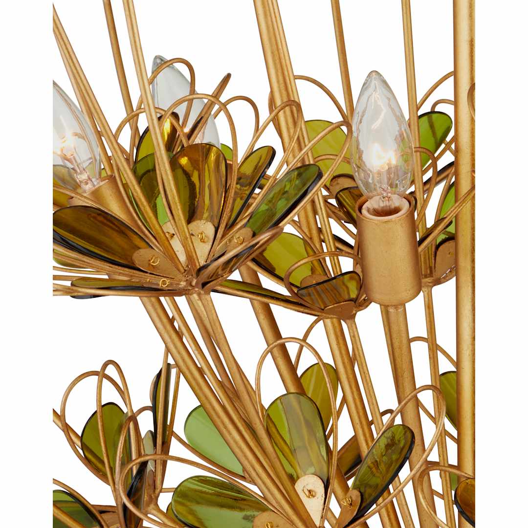 The Midsummer Chandelier is an artful adaptation of nature's beauty. The frame of the graceful gold chandelier is covered in a contemporary gold leaf finish that enlivens the green recycled glass petals on the blossoms. The oblong pieces of glass are surrounded by wire that is bent to mimic their shapes, also in a contemporary gold finish. The overall effect the layering provides brings the floral motifs a fluttering feel.