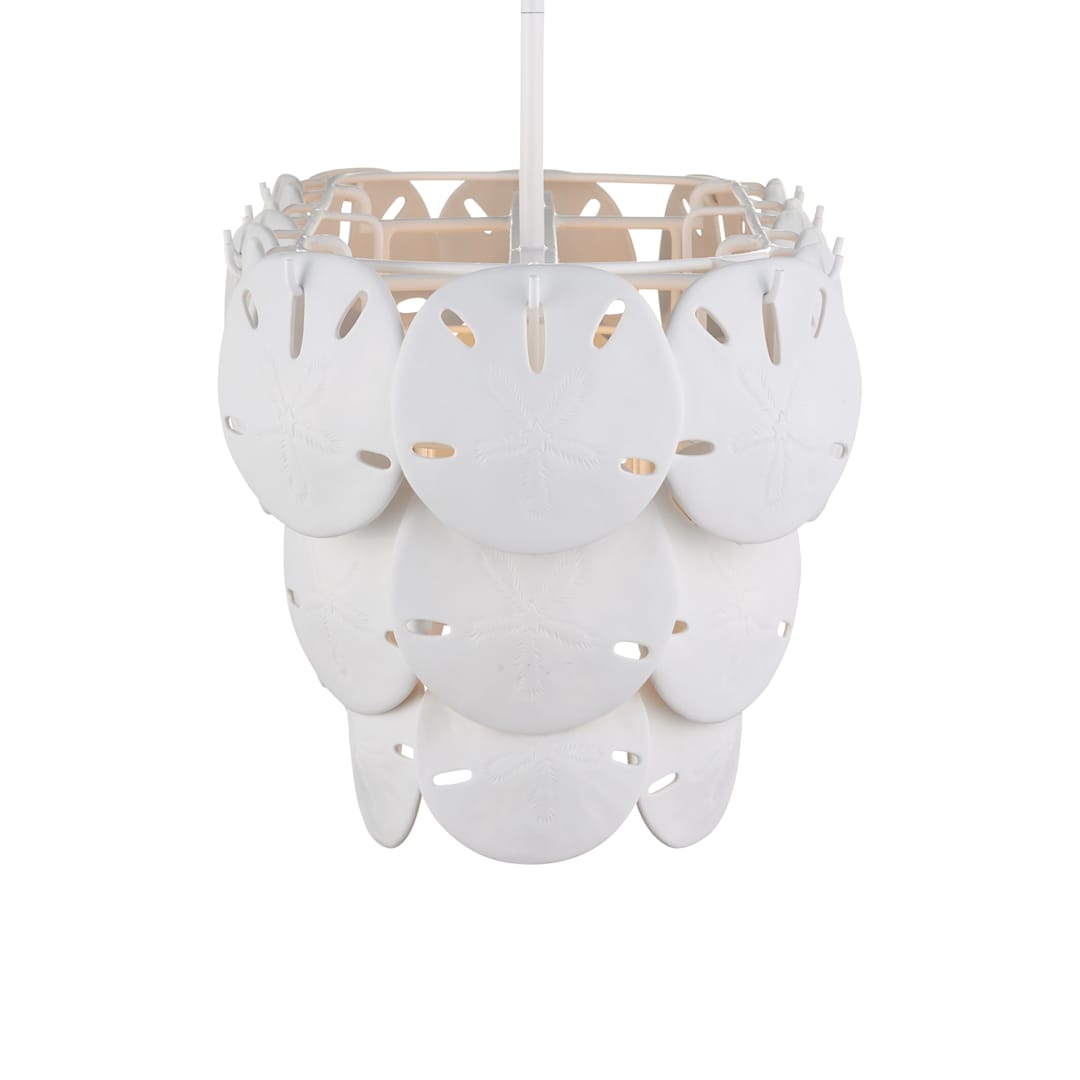 Marjorie Skouras designed the Tulum Oval Chandelier, inspired by the tropical beauty of the Yucatan Peninsula where she lives. This is an elegantly delicate design, as the sand dollars are cast in semi-translucent bone china and they make a pretty sound when a strong breeze ruffles them. There are three sizes of removable sand dollars on this design, which makes it easy to clean. The sugar white finish on the hardware complements the pale discs on this nature-inspired chandelier, making it apropos for rooms overlooking the ocean.