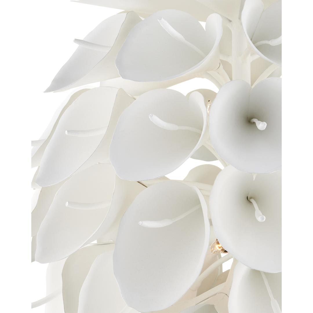 The Diego Chandelier is a magical teardrop-shaped fixture made from wrought iron in a white gesso finish. This graceful chandelier was designed by Marjorie Skouras to continue her celebration of the Yucatan Peninsula that she calls home. The Calla Lily, which flourishes in her surroundings, inspired this white chandelier, which joins a number of her offerings that celebrate the flora and fauna around her studio.