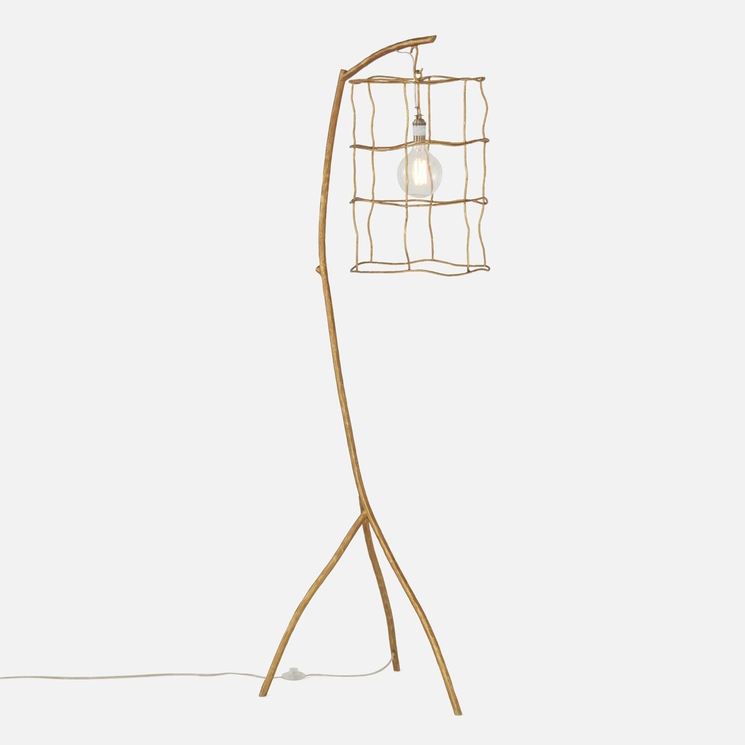 - Our aged brass Cyprian floor lamp's sculptural suspending caged shade with an exposed bulb and curved twig tripod base mixes industrial sensibility with a touch of whimsical elegance.