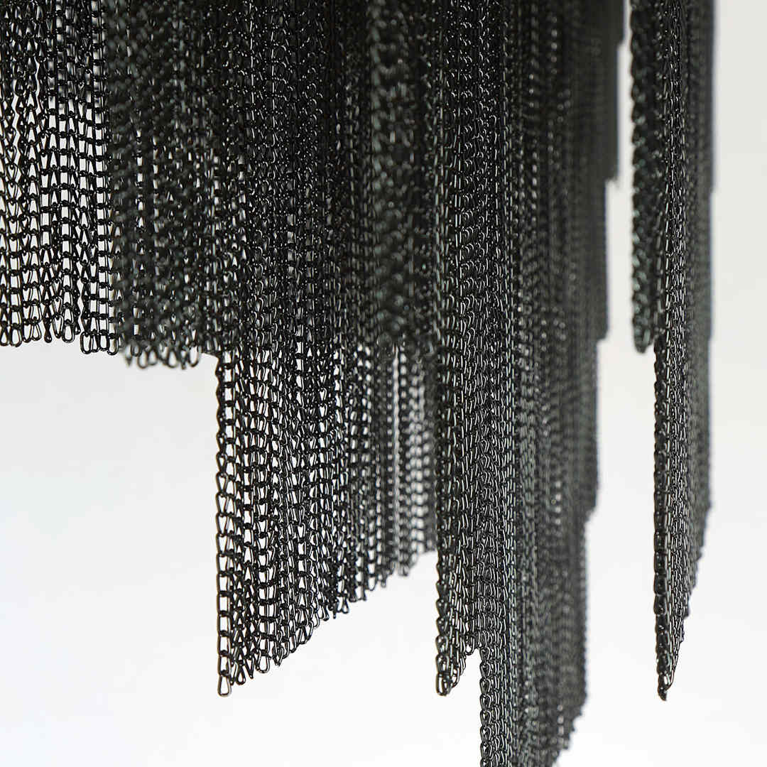 A lustrous collection of delicate, high-gloss metal chains cascade like gleaming streams of water in this transitional piece, now featuring a black finish.