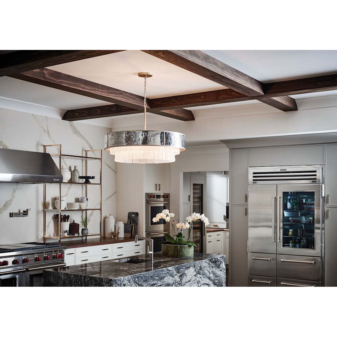 Reverie features a fanciful combination of finishes and shapes to create an opulent transitional silhouette. The robust, hammered stainless steel drum encompasses the textured crystal accents, which create a stunning profile from below. Metal binding adds an artisan touch that completes the look.