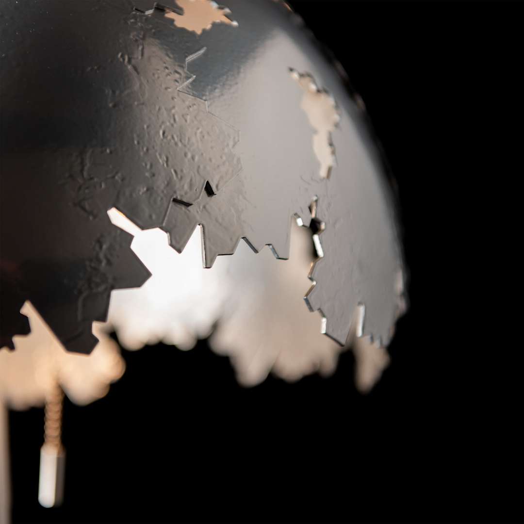 According to designer David Martin, the Pangea Dome Table Lamp features a hand-forged shade referencing the historic breakup of the supercontinent millions of years ago, grounded by its exquisite base for a small footprint. Chain-pulls for its two medium-base bulbs add function with style.