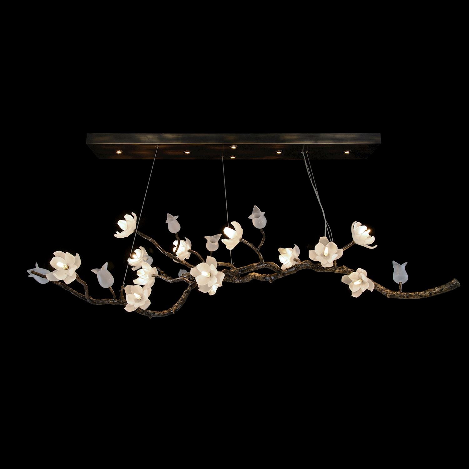 - This oblong chandelier has branches in bronze with thirteen frosted mouthblown glass magnolia lights and ten decorative frosted mouthblown glass tulips.