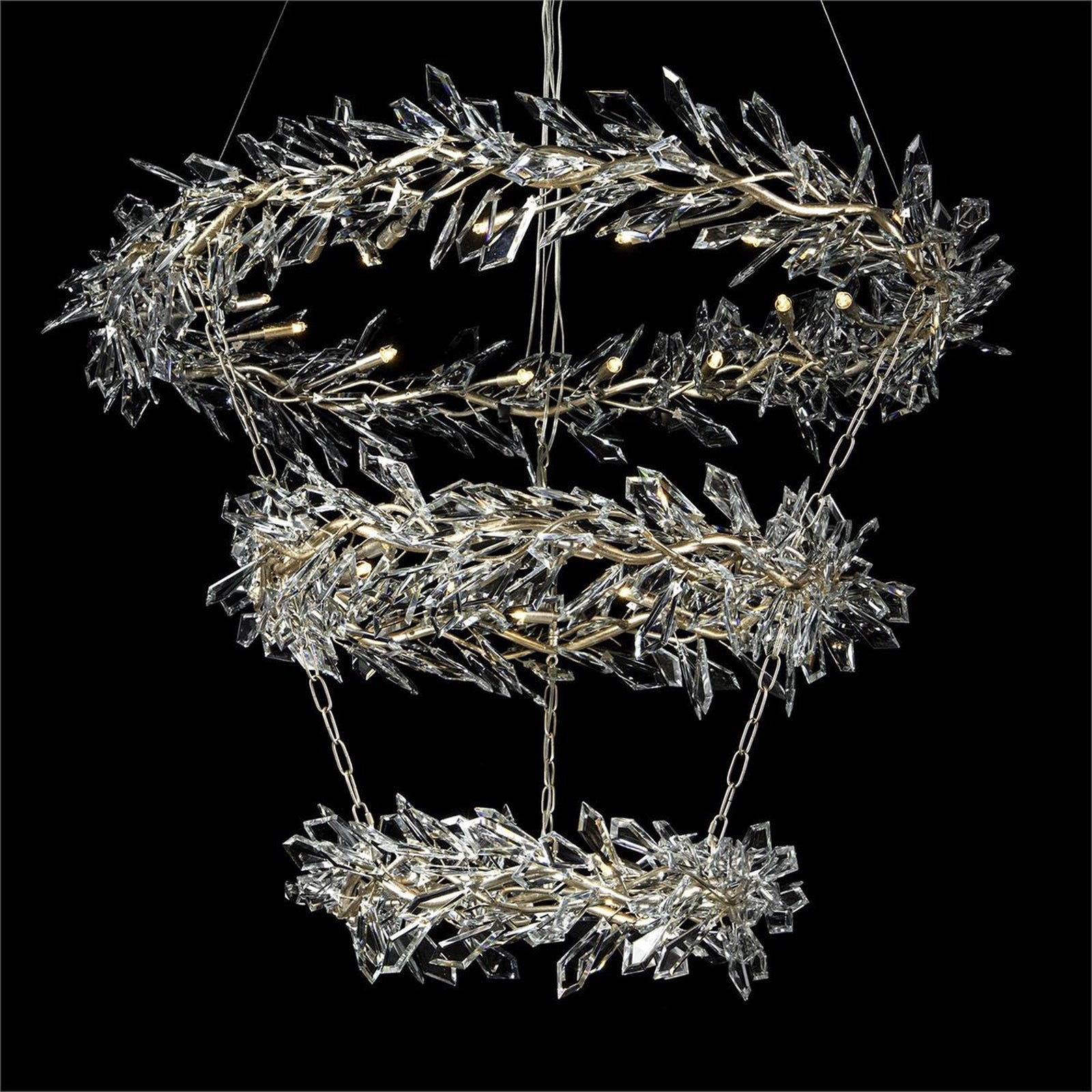 - This thirty-four-light pendant chandelier in antique silver leaf features three halo tiers of gorgeous, hand-cut crystals.
