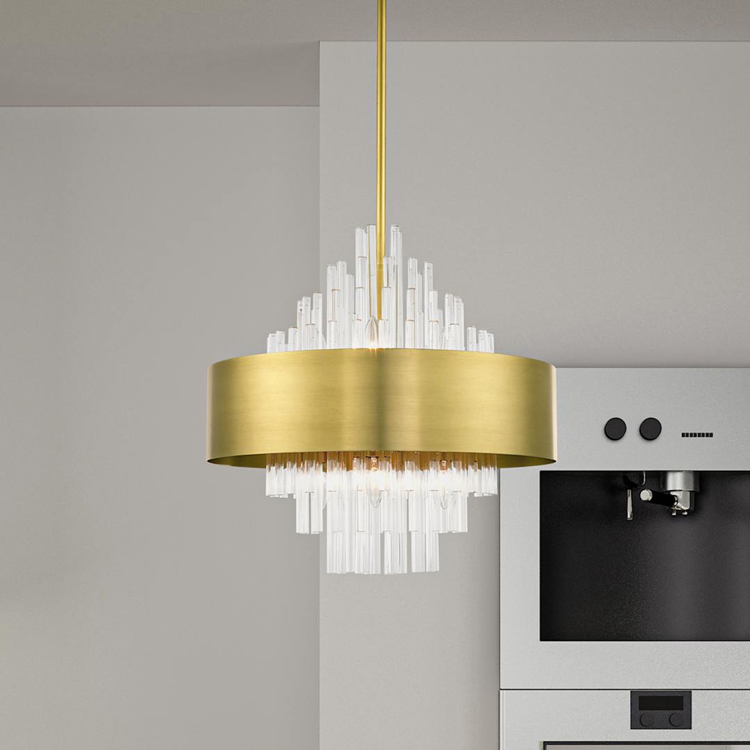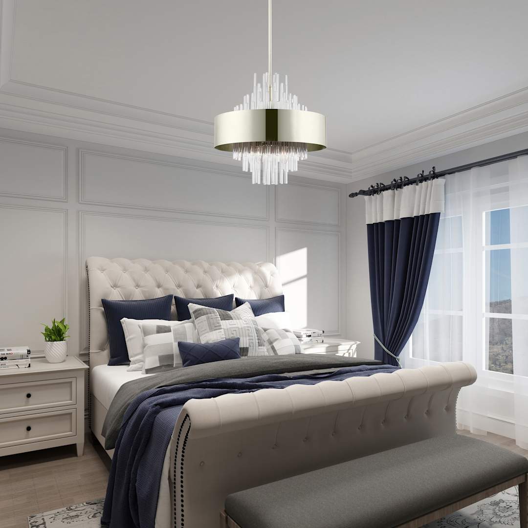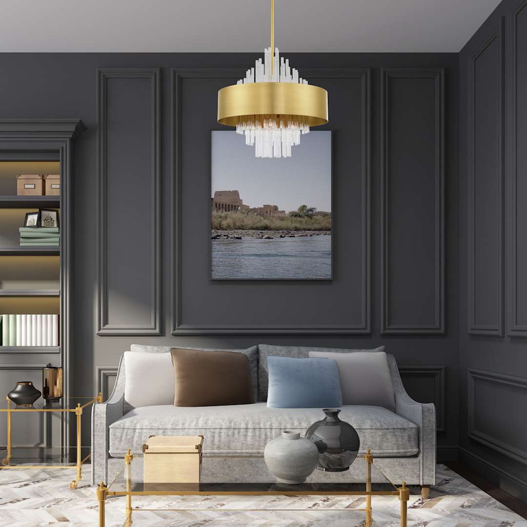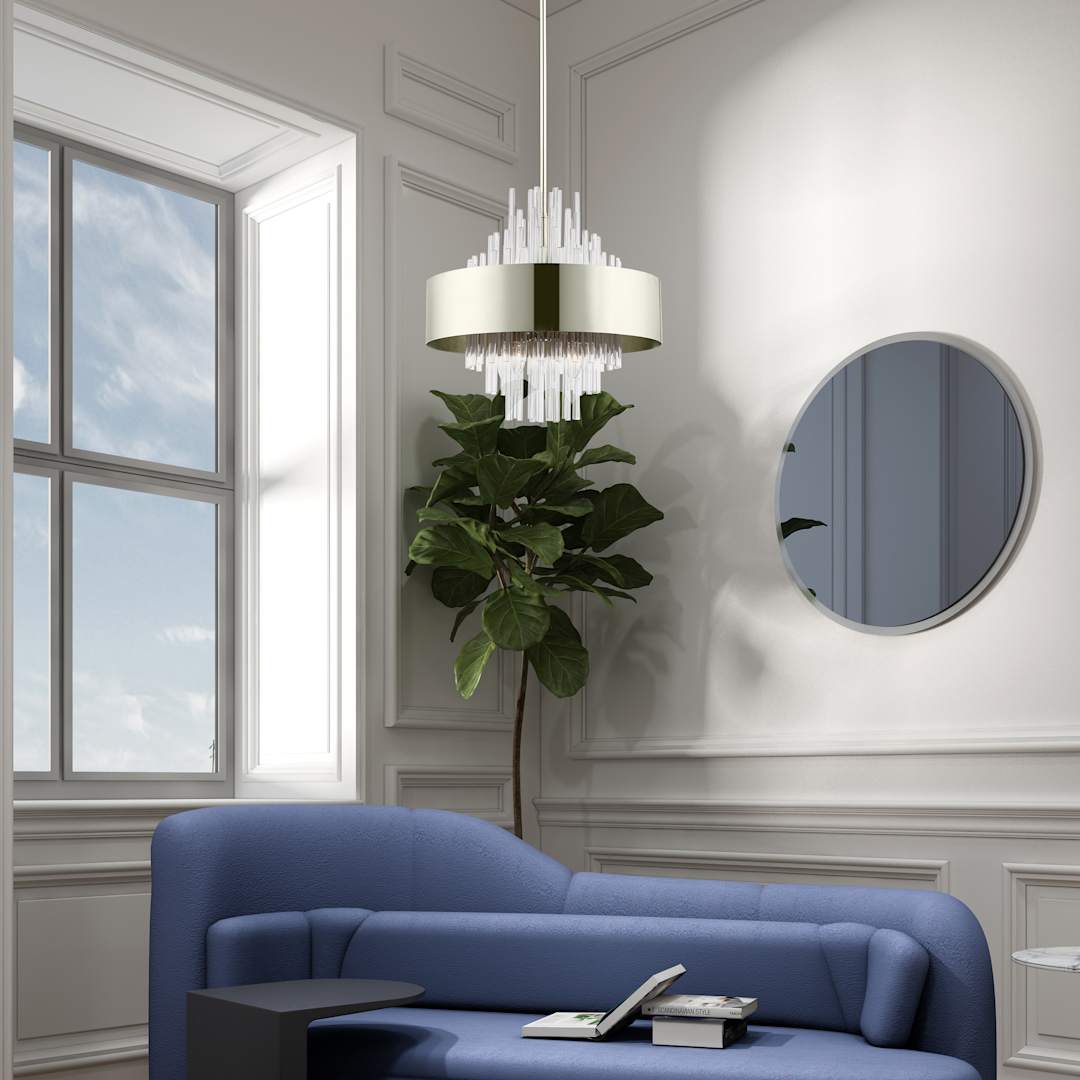 A dramatic addition in this sophisticated contemporary pendant brings a sense of luxury. Crystal rods tower above and hang below the shade which creates a stunning visual aesthetic.