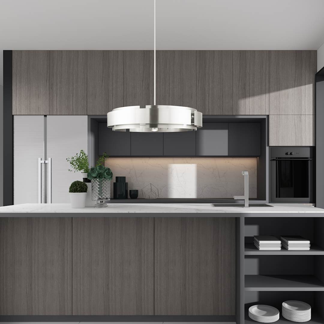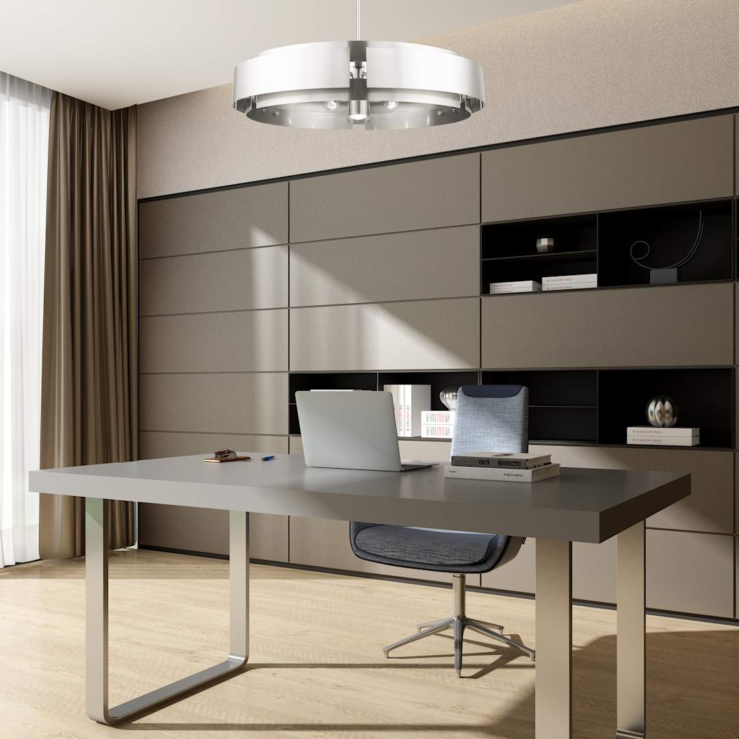 Distinctive in any contemporary or urban space, this 5 light pendant lends to contemporary industrial character. This pendant features 4 lights and 1 down light wrapped up in an overlapping stainless steel curve shade which is sure to catch your eye.