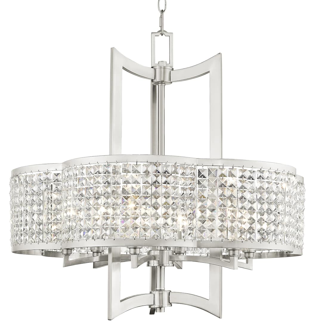 Crystal strands strung in a decorative shade design define this classically glamorous chandelier in which the bulbs are completely shaded, allowing the light to shine through the K9 crystal for a warm, intimate lighting feel.