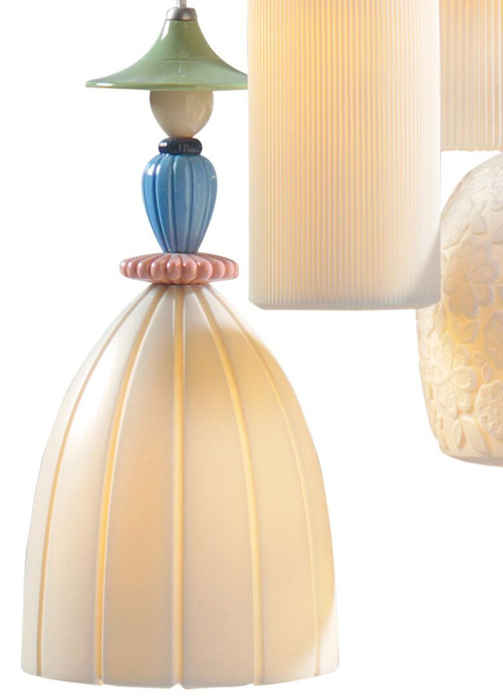 - Handmade hanging ceiling lamp in brightly colored porcelain and floral decorations with four engraved translucent white porcelain tulips.