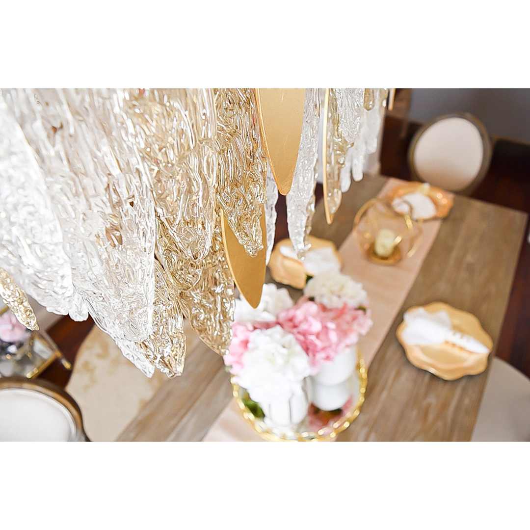 Hand-formed glass petals of Clear and Champagne-tint suspend from a tiered frame of gold and accented with petals of solid metal finished in Gold Leaf. Numerous candelabra sockets are strategically placed within the fixture to create glimmer and elegance to this majestic collection.