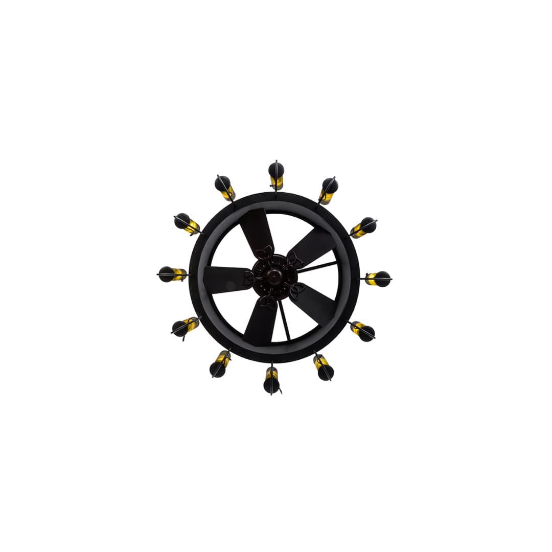 A taste of Italy meets custom lighting and fan technological innovation as a dozen inverted Antique Green Frosted wine bottles are supported by curved arms with bobeches for beautiful ambient lighting. Each bottle is delicately etched with an appealing Grape design complemented with hand forged iron Grape Vine wrap around its neck. This Chandel-Air is so cool and so much fun that you may want to hang from this fixture. But don't. A unique conversation piece. This gothic rustic frame encases a 30-inch fan that spins quietly in the center with superb efficiency. Custom crafted in the USA.