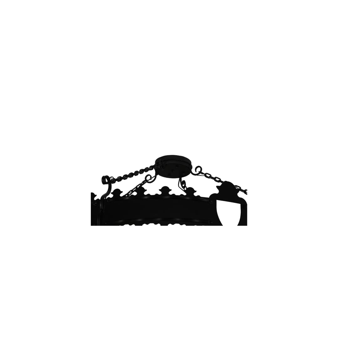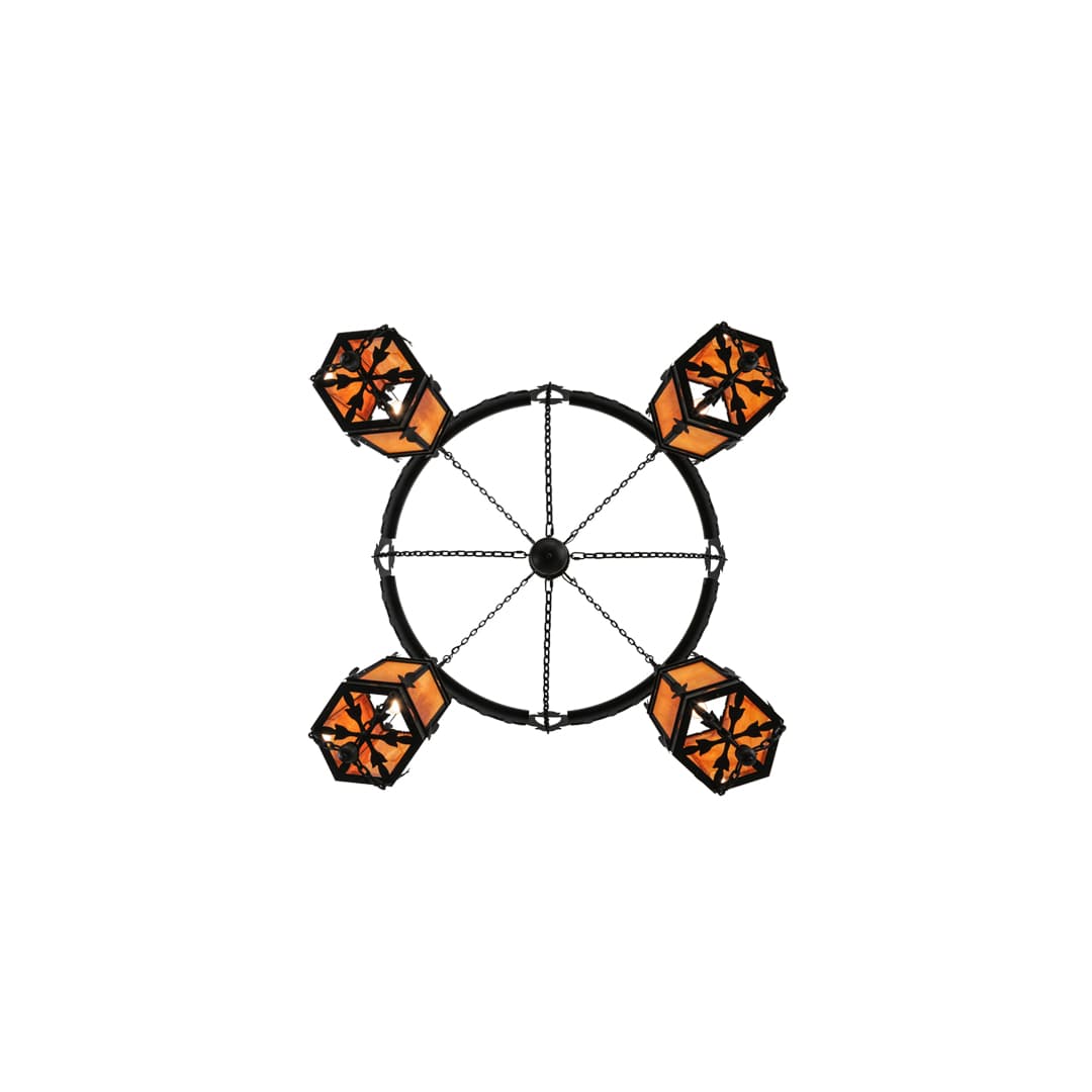 A Grand styled chandelier that incorporates a unique Gothic design and beckons with light. Valhalla features 4 decorative lanterns that reveal Ambra Siena Idalight which is complemented with hardware in a Blackwash finish. The impressive decorative ring and shade frames, shown in a matching finish, are embellished with decorative accents and shield medallions. Handcrafted in the USA by highly skilled artisans in Upstate New York, this striking fixture is offered in custom styles, colors and sizes are available. Energy efficient lamping options such as LED are available.