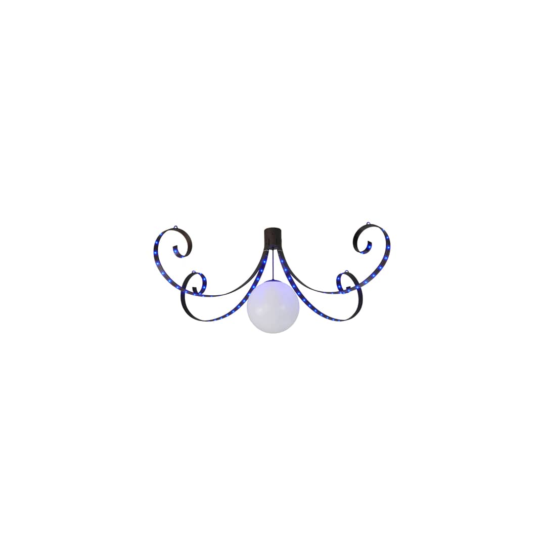 A prodigious design with a colorful flair. A Statuario Idalight orb is the center of attention as four scrolled arms embody Integral LEDs with RGB for vibrant ambient illumination while a Medium based lamp brings out the beauty of the Idalight. The hardware and frame are designed with a warm Cajun Spice finish. The fixture is custom crafted in the USA. Custom colors, styles, sizes and dimmable energy efficient lamping options such as LED are available.