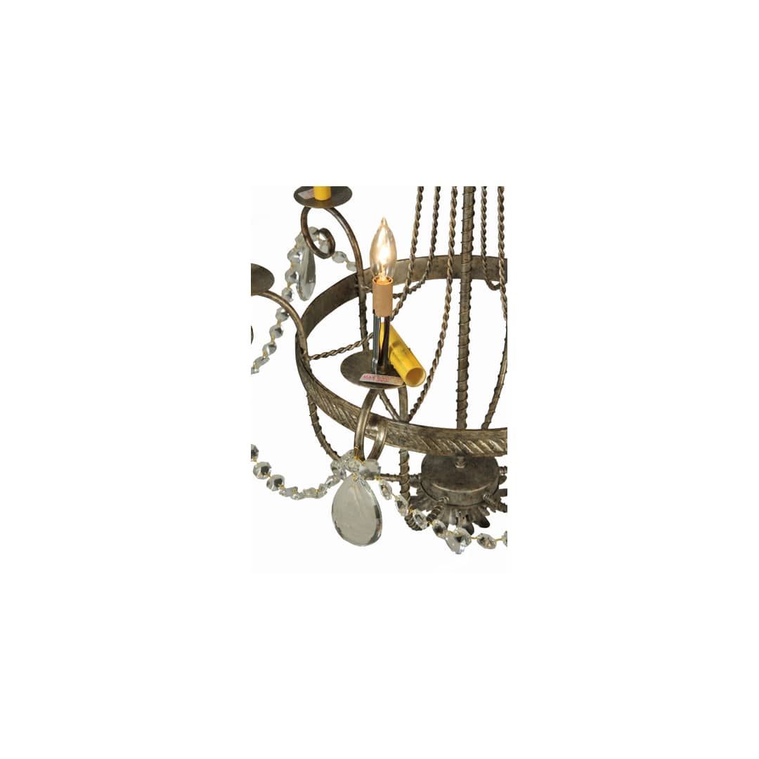 Exquisite styling and luxurious charm are reflected in this 6-light chandelier. This fixture combines faceted crystal charms, textured scroll arms, an Acanthus leaf accent and rich Corinth finished hand-forged hardware. This elegant chandelier embraces 6 Amber faux candlelights. This chandelier features quality materials and hand detailed American craftsmanship perfected by years of time honored artistry, passed down from generations of highly skilled artisans. Custom sizes, styles, colors and dimmable energy efficient lamping options such as LED are available.