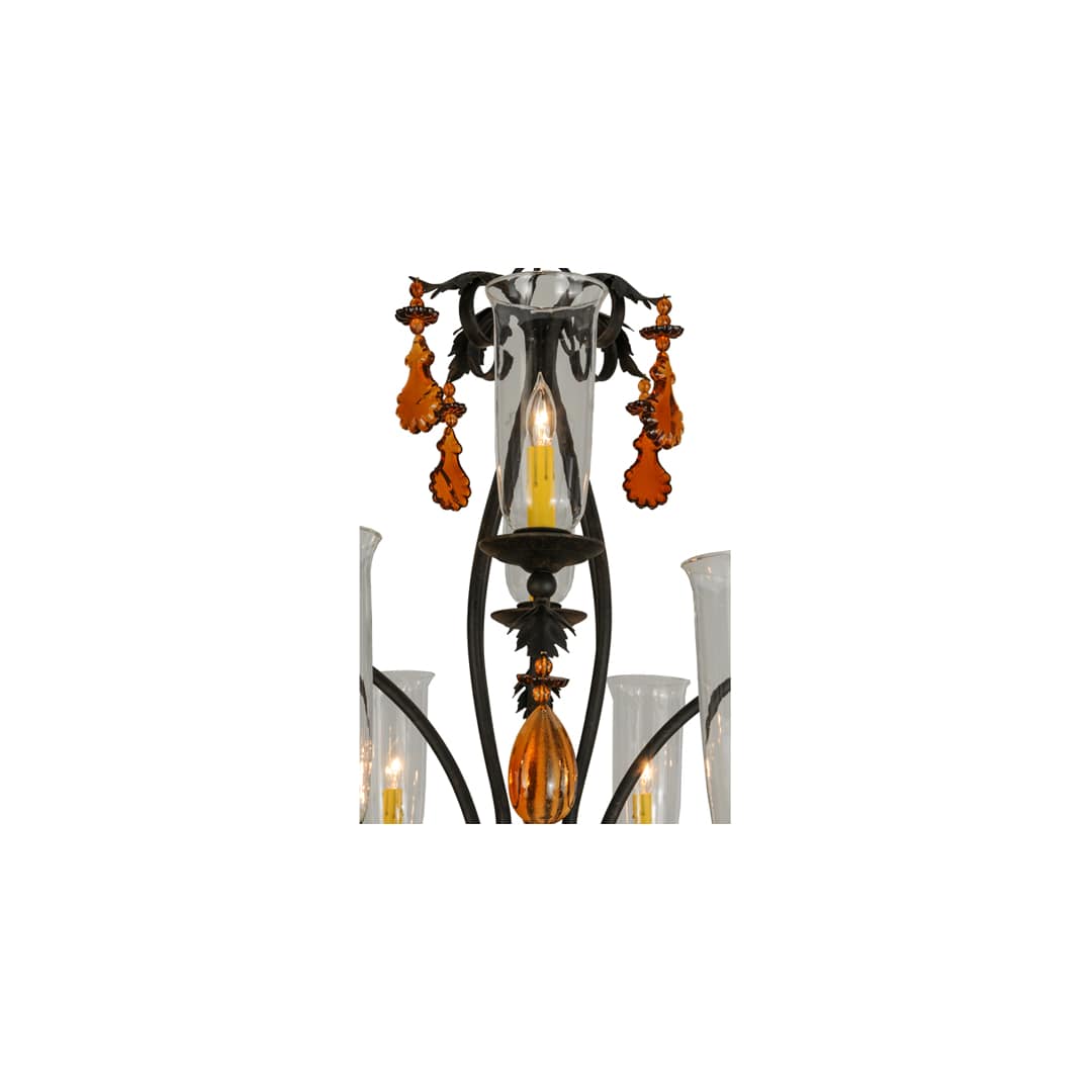 Inspired by the beauty and grace of ballrooms in renowned castles and mansions spanning the globe, Windsor features 14 Clear Glass Hurricane styled shades that reveal Ivory faux candle lights. The elegant shades are embraced with bobeches with Acanthus Leaf Accents and Amber Crystal Orb and Pendalogs on a frame with hardware featured in a Chestnut Textured finish. The overall height ranges from 43 to 150 inches as the chain length can be easily adjusted in the field to accommodate your specific lighting application needs. Handcrafted by highly skilled artisans in our 180,000 square foot manufacturing facility. Available in a wide range of custom choices including various finishes and sizes.
