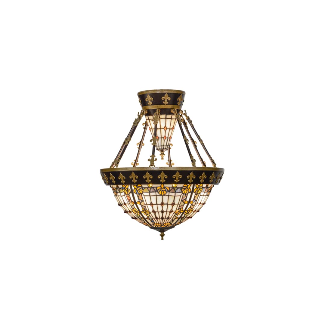 Reminiscent of castle and cathedral stained glass, the Fleur-de-lis holds a prominent place in French Heraldry. An intricate design of Golden stylized tri-petaled irises and Amber jewels against multicolored bands, surrounding a mottled Beige and Honey field. Detailed hardware hand finished in Copper Vein with Nu Gold accents, cradles the stained glass shade handcrafted utilizing Meyda Tiffany's famous copperfoil construction process. Color coordinated illuminated cathedral hub with steel arms accented with Golden fleurs.
