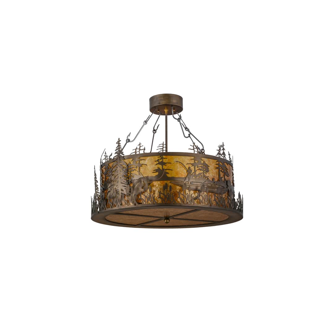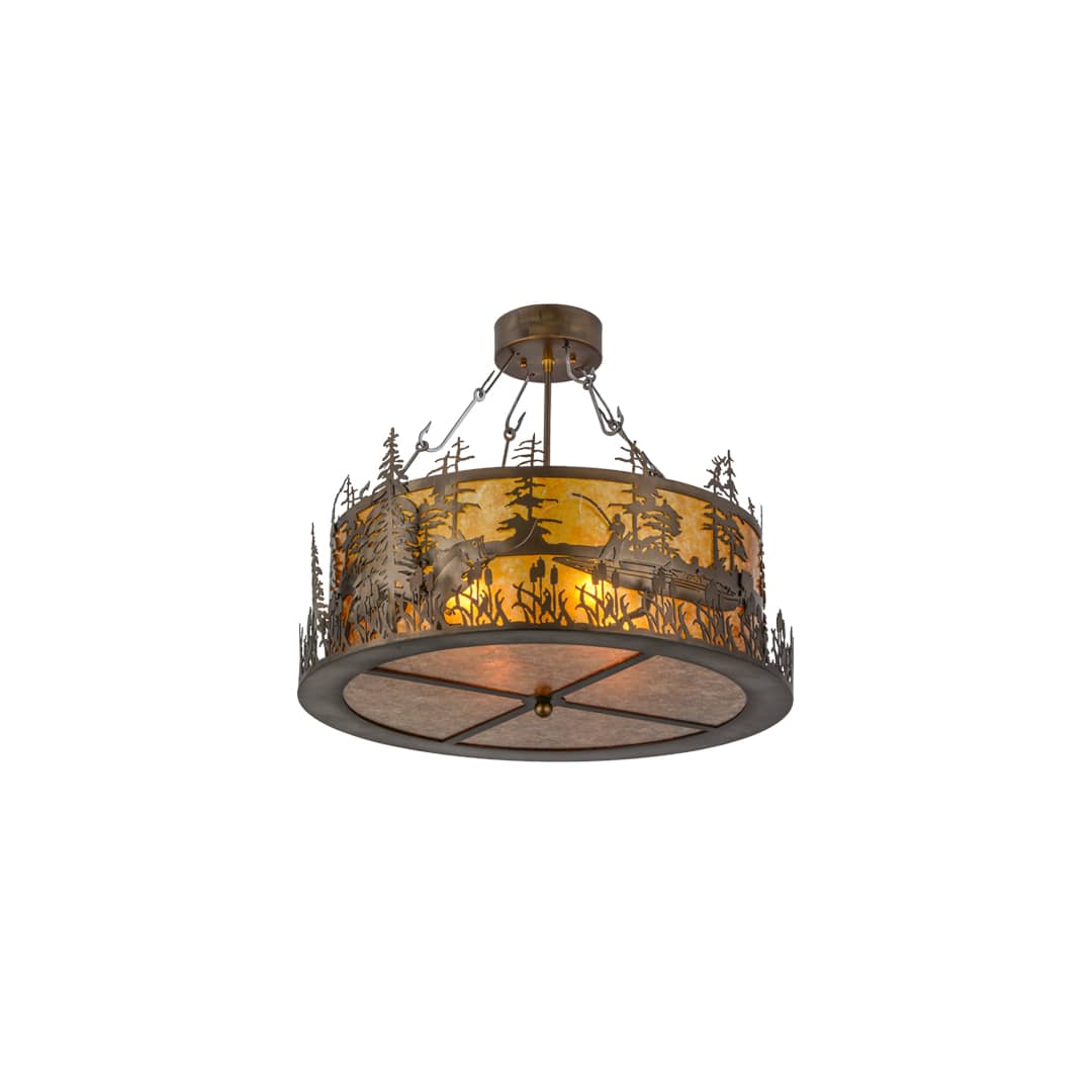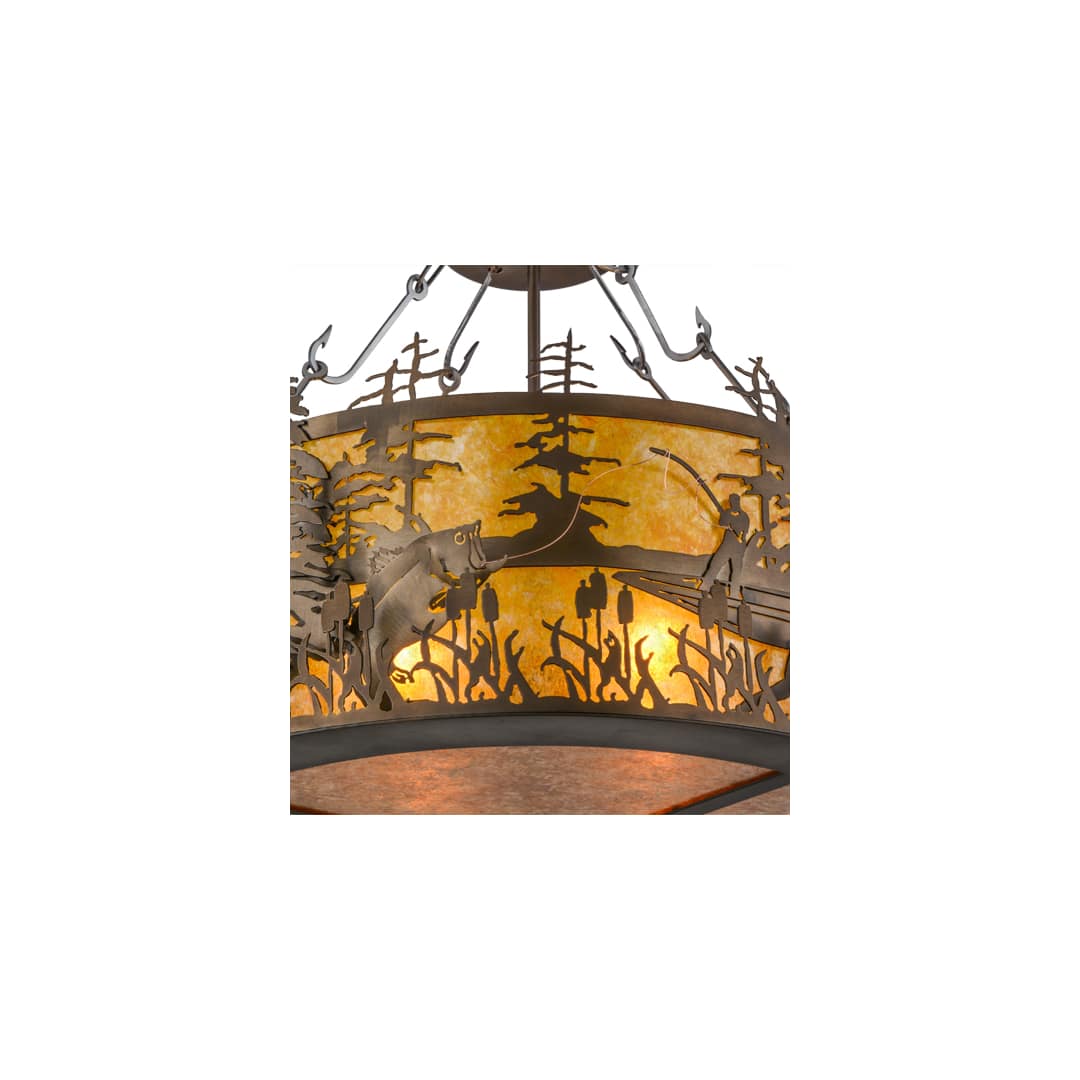 A sportsman hooks a Wide Mouth Bass in a mountain stream while the morning sun rises in the background. Warm soft ambient light is diffused beautifully through an Amber Mica lens and bottom diffuser, which are enhanced with Antique Copper finished accents and frame, including decorative fishhooks attaching the shade to the canopy. The fixture is handcrafted in the Meyda manufacturing facility at the foothills of the Adirondack Mountain Lake Region in the USA. Custom styles, designs and sizes are offered. Energy efficient lamping options are available as well.