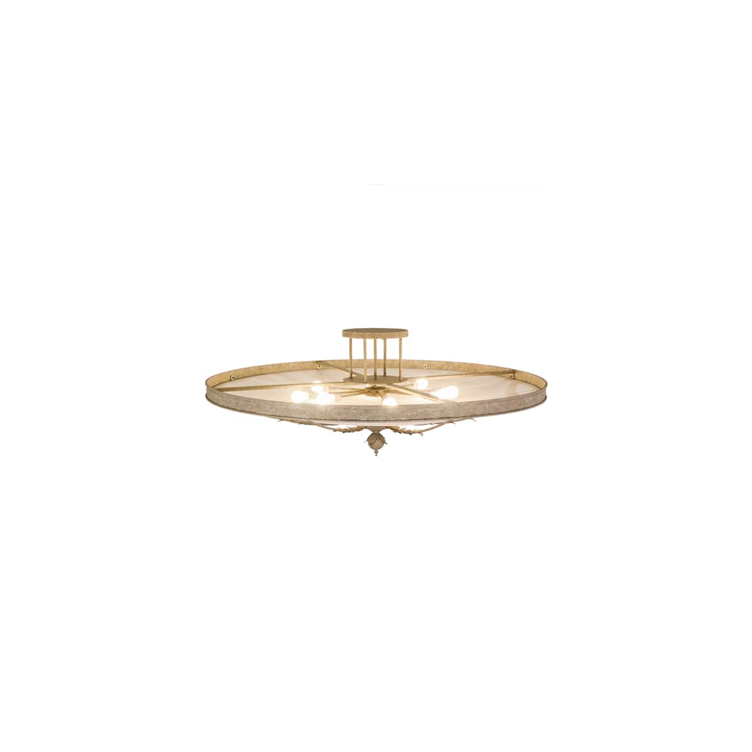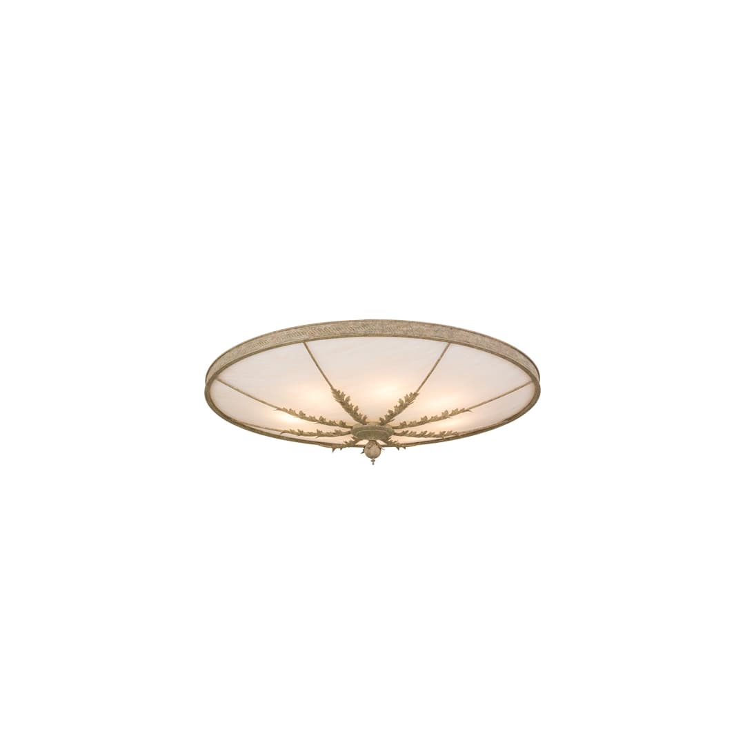 Adorned with steel accents that replicate Acanthus leaves in a handsome Pate finish, this large contoured ceiling fixture features a Fleshtone Idalight shade with decorative trim, a ballpoint accent and matching hardware. This fixture is ideal for lobbies, conference rooms and other large spaces in residential and commercial settings. Hoja is handcrafted by highly skilled artisans in our 180,000 square foot manufacturing facility in Yorkville, New York. This fixture is available in a wide range of custom choices including various designs, colors, sizes and dimmable energy efficient lamping options such as LED.