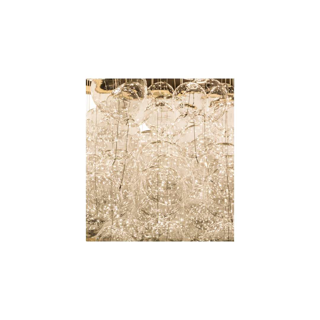 - Includes a gold organza shade with clear glass bubbles