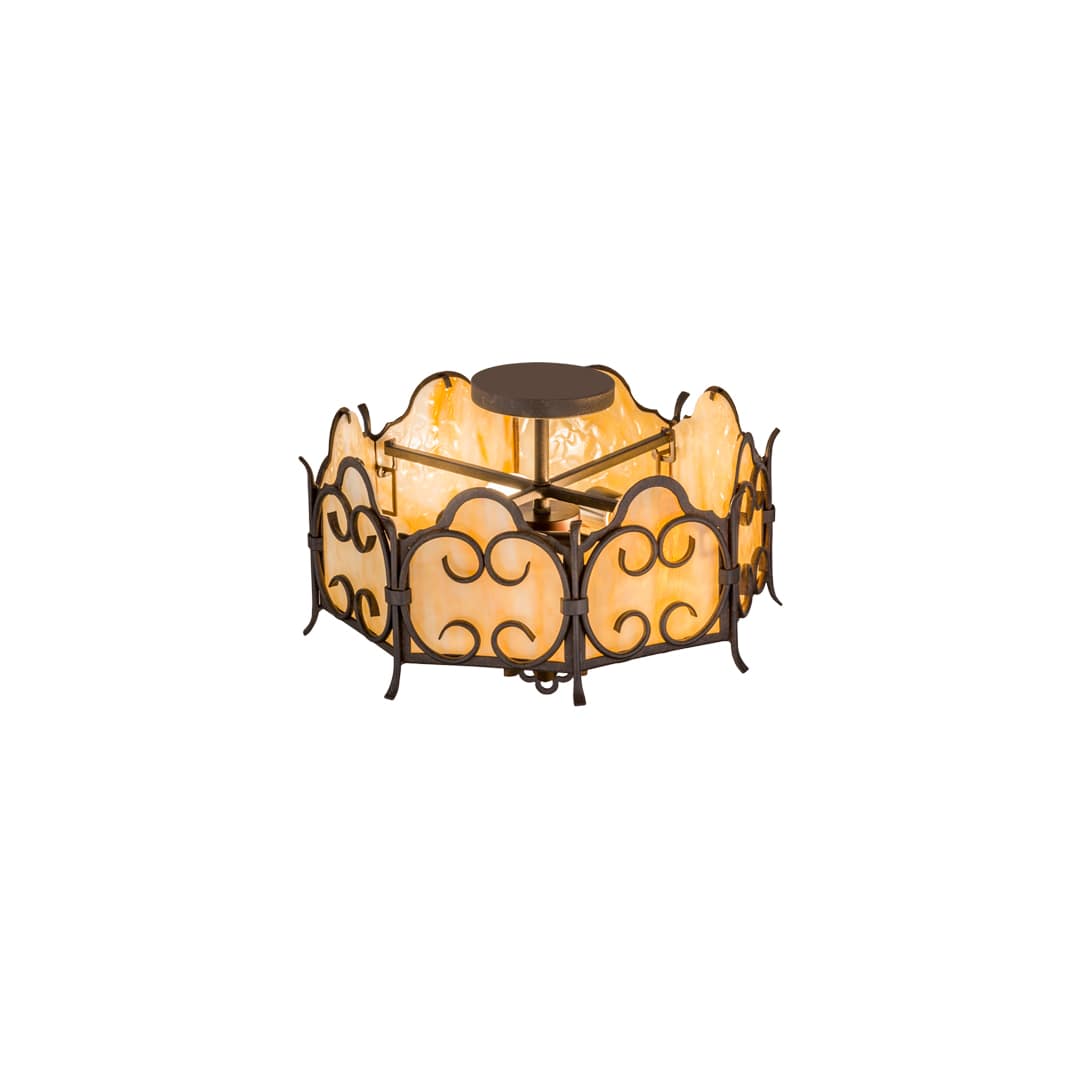 Dramatic elegant scroll designs are highlighted on six side panels and the bottom diffuser of this beautiful fixture, which is featured in stunning Beige art glass. The scrolls, decorative accents and matching hardware are all featured in an exquisite Chestnut Textured finish. Handcrafted in the USA, this pendant is available in custom sizes, styles and colors, as well as dimmable energy efficient lamping options. This fixture is UL and cUL listed.