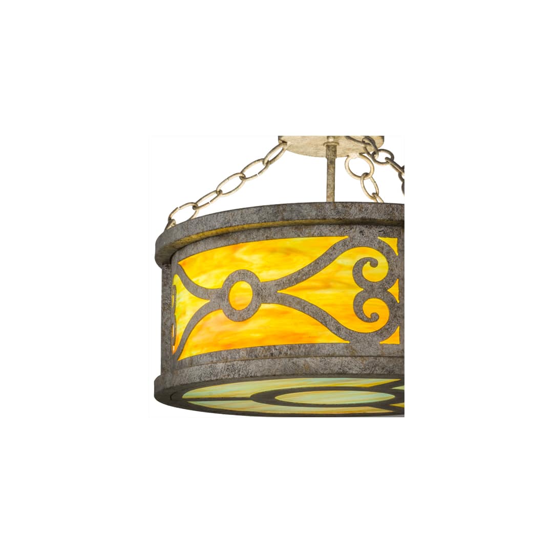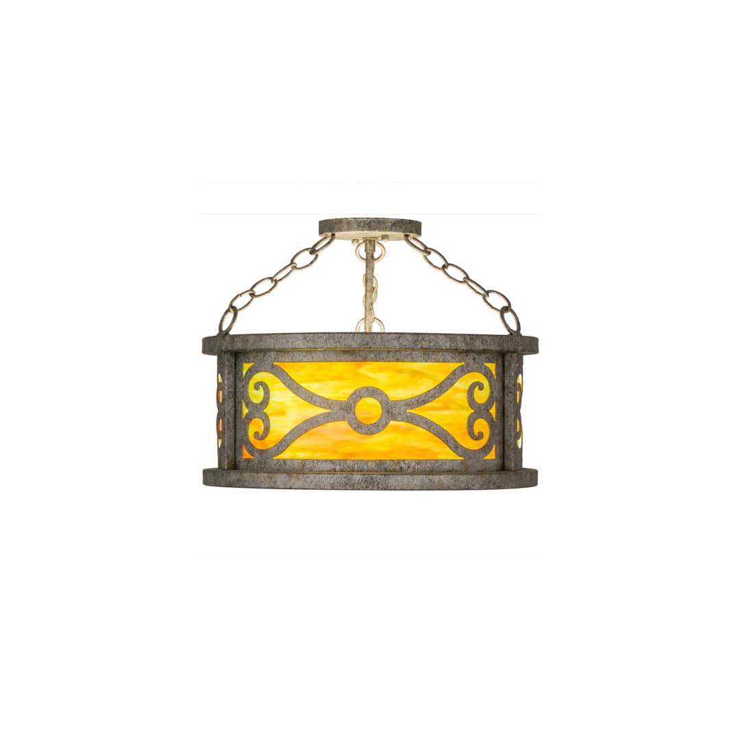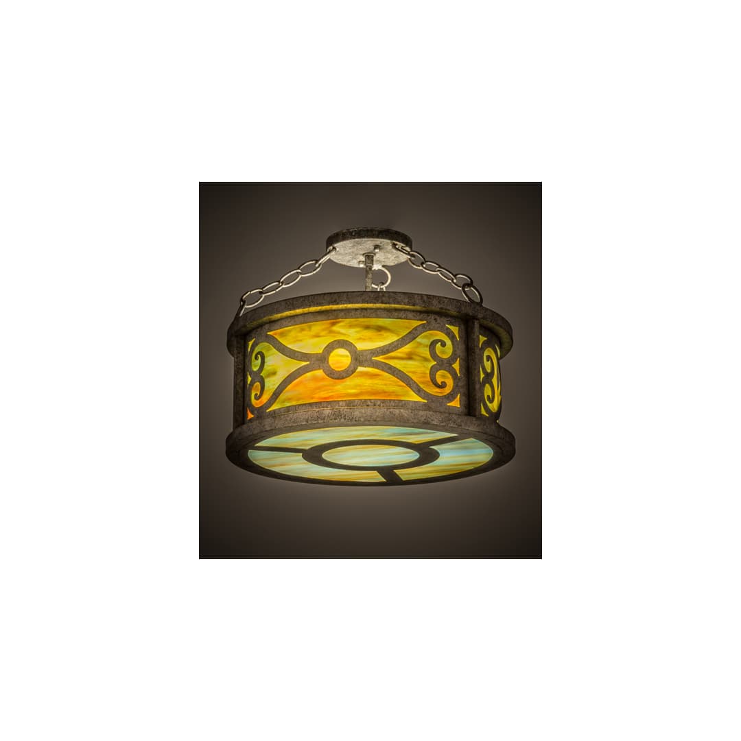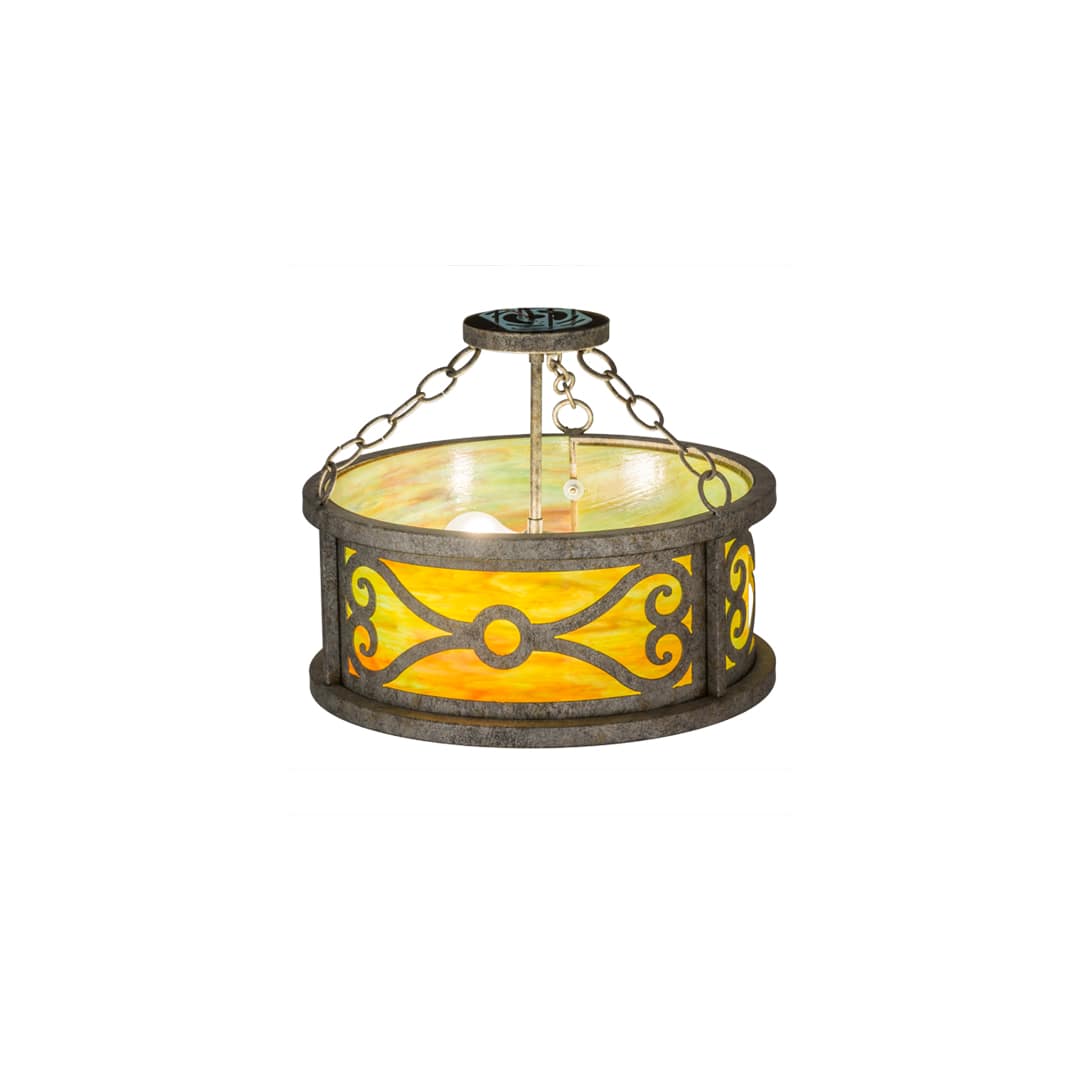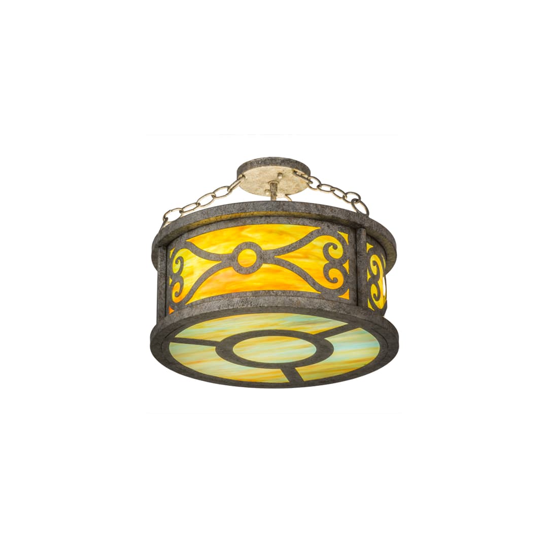 A distinctive lighting design, Donya reveals an exquisite rotund profile with an appealing design that combines Corinth finished decorative scrolls and a geometric motif with art glass in Jade, Rust and Blue. This fixture, which reflects the innovative versatility and capabilities that have become synonymous with our lighting products, utilizes a blend of old world craftsmanship and 21st century technology. The ceiling fixture is handcrafted by talented artisans in the USA in our manufacturing facility. Available in custom designs, sizes, colors and dimmable energy efficient lamping options.