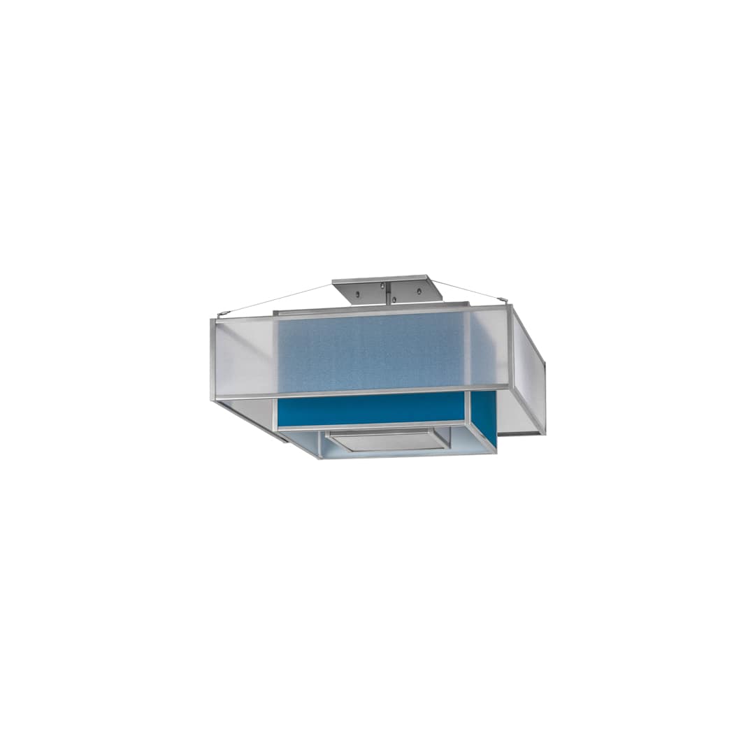 Rendering a stunning architectural look, this structural geometric design features an outer and interior diffuser custom crafted of Silver TextraLite. Between the two layers is a square shaped profile created with stunning Teal Textrene. This unique ceiling fixture is enhanced with decorative accents, frame and hardware featured in a Nickel finish. Handmade by highly skilled artisans in our 180,000 square foot manufacturing facility in Yorkville, New York, available in custom sizes, styles, colors and lamping options such as LED.