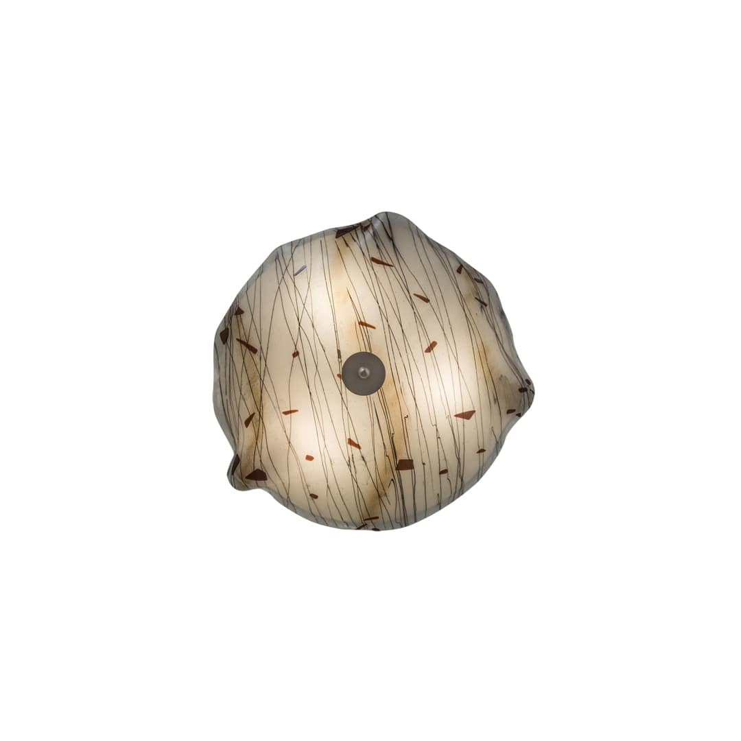 Italian for small branches or twigs. The Ramoscelli ceiling fixture features an abstract expressionist lighting design. Inspired by bare trees against a Winter White sky, this inverted shade highlights our innovative Fused Glass. White iridescent glass is fused with Black Twig-like streamers with Plum colored accents and Bronze Frit sprinkled across the shade. Ideal for foyers, corridors and other spaces in a variety of residential and commercial settings. Traditional workmanship, high fire kilns and original tools are used to fuse glass in our 180,000 square foot manufacturing facility in Yorkville, New York. Diffuser colors, metal finishes and fixture sizes can be customized to your needs.