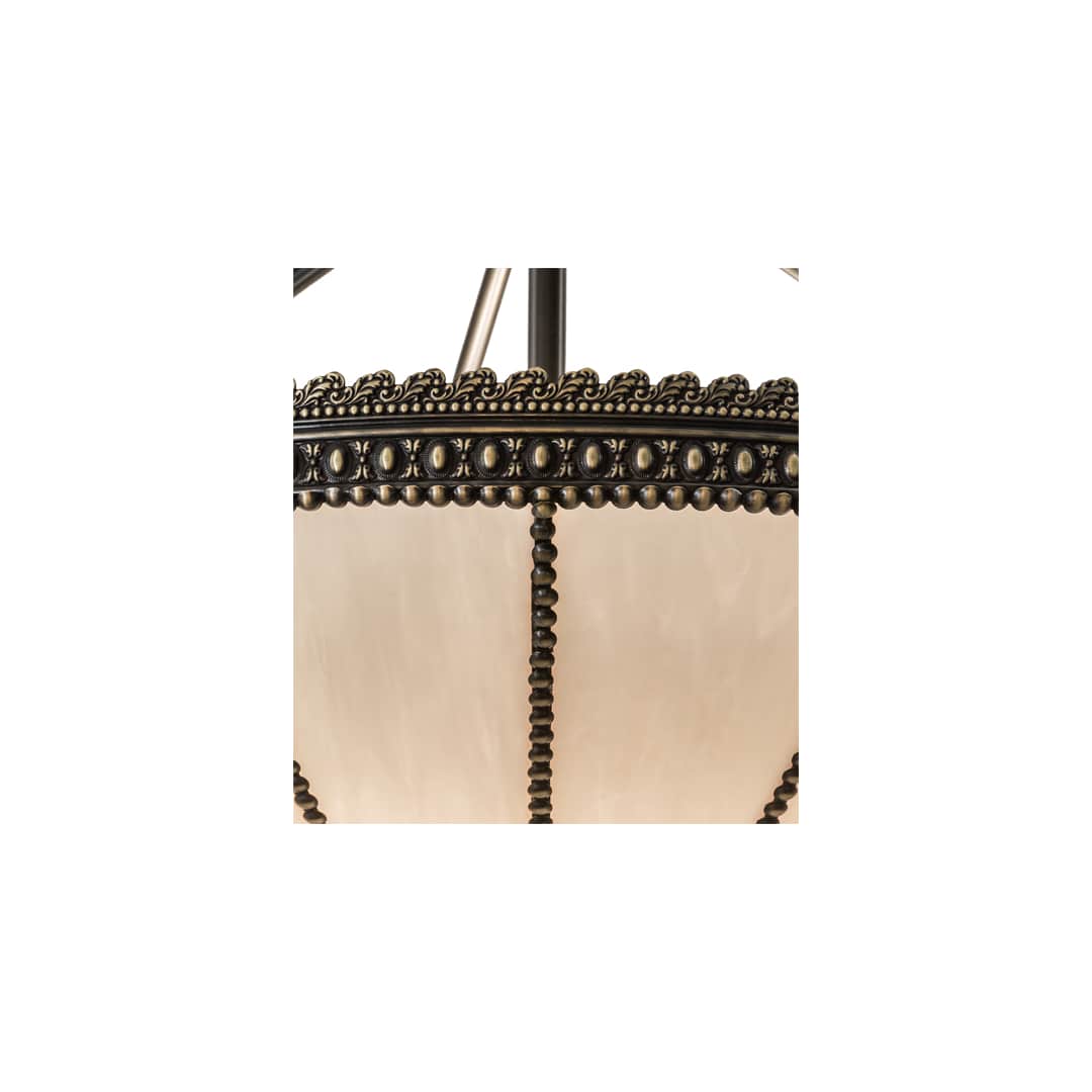 Created with Brass and Glass, this elegant ceiling fixture features beaded filigree with a miniature button and bow design accenting the decorative trim. Matching filigree create the classic design on this White art glass diffuser which is created using Meyda Tiffany's famous copperfoil construction and accented with a matching finial. The Solid Brass decorative accents, frame and hardware of Shansky are featured in a Craftsman Brown finish with Brass Highlights. Custom crafted in our manufacturing facility in Upstate New York in the USA, this semi-flushmount is offered in custom sizes, styles and colors, as well as dimmable energy efficient lamping such as LED.