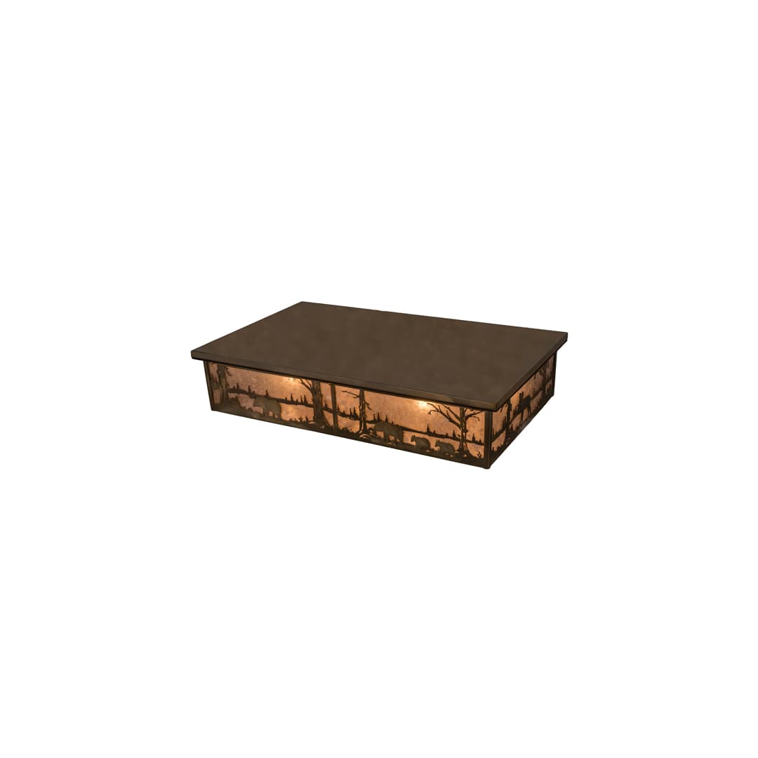 A majestic Moose and a Bear with her Cubs meander alongside a mountain lake as the late afternoon sun casts a golden glow, creating a picture postcard image for this charming ceiling fixture. Eye-catching Silver Mica is featured on the lens as the decorative accents and hardware are offered in an Antique Copper finish. This oblong fixture is custom crafted by highly skilled artisans at the foothills of the spectacular Adirondack Mountains in Upstate New York. Custom sizes, styles and colors are available, as well as dimmable, energy efficient lamping options.
