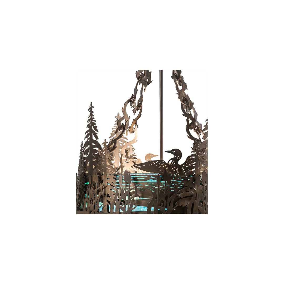 Listen to the melodious calls of the Loon echo across clear a mountain lake among tall pine trees as this aquatic bird wades in the water. Beautiful ambient light evokes from a Blue Water Glass shade, which is complemented with alluring decorative accents, frame, and hardware highlighted in a Black finish. Handcrafted in our manufacturing facility at the foothills of the Adirondack Mountain lake country in Upstate NY, this nature inspired fixture is perfect for wherever you want to make a design statement. Custom sizes, styles, and colors are available, as well as dimmable energy efficient lamping options such as LED.
