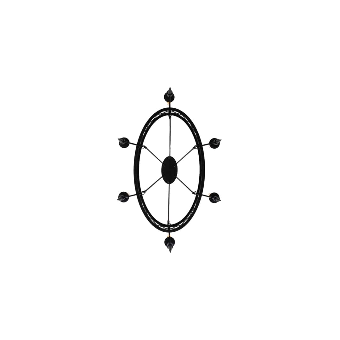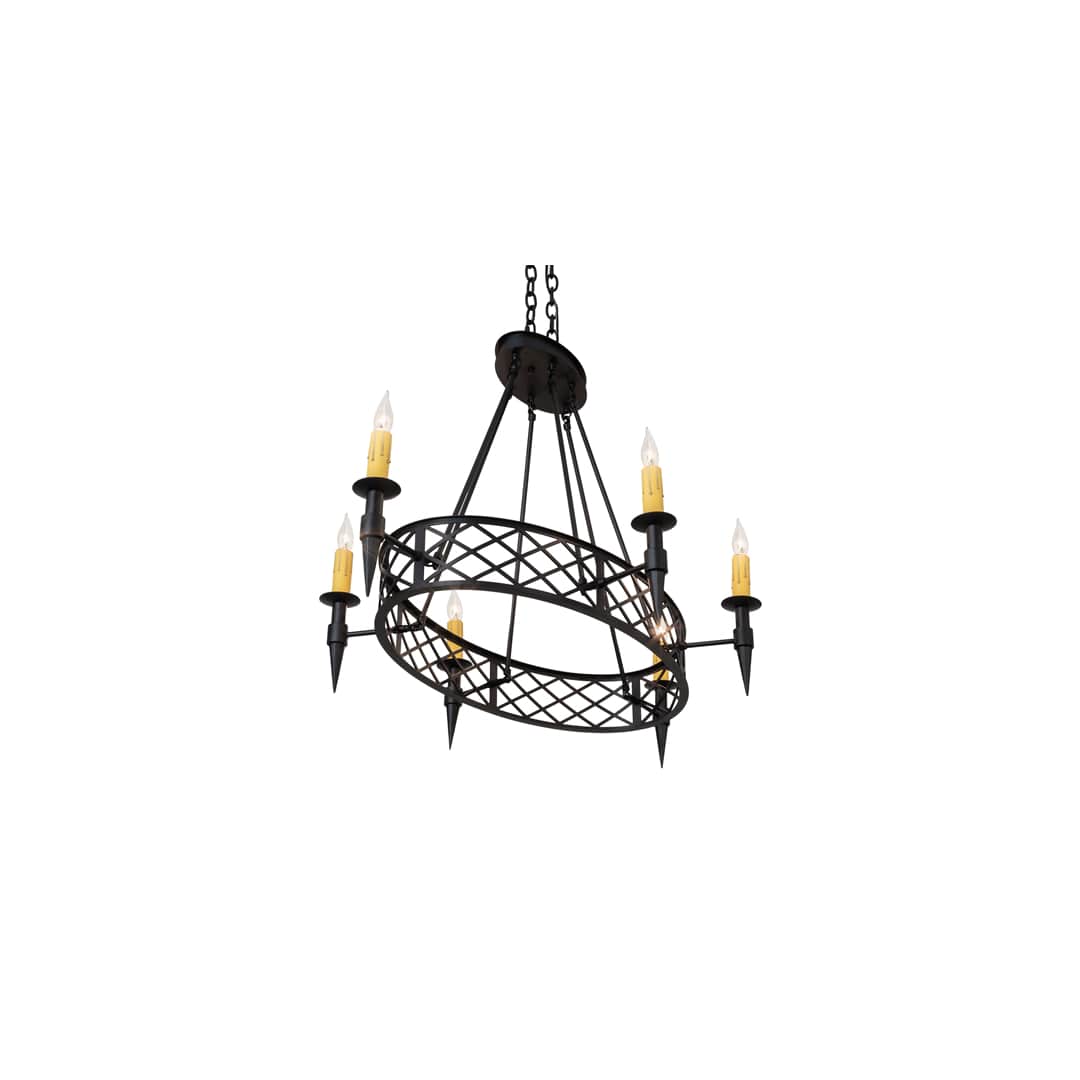 Inspired by Marjorie Merriweather Post's retreat in Paul Smiths outside of Lake Placid, New York. The original chandelier was installed in the Main Lodge in the vacation camp built in 1923. This stunning chandelier features diamond shaped silhouettes throughout the rounded oblong frame which embraces 6 Ivory faux candle lights. This chandelier is ideal as a centerpiece for a wide variety of rooms. The chain length can be easily adjusted in the field to accommodate your specific lighting application needs. Handcrafted by highly skilled artisans in our 180,000 square foot manufacturing facility in Yorkville, New York. Candlelight colors, metal finishes and fixture sizes can be customized to your needs.