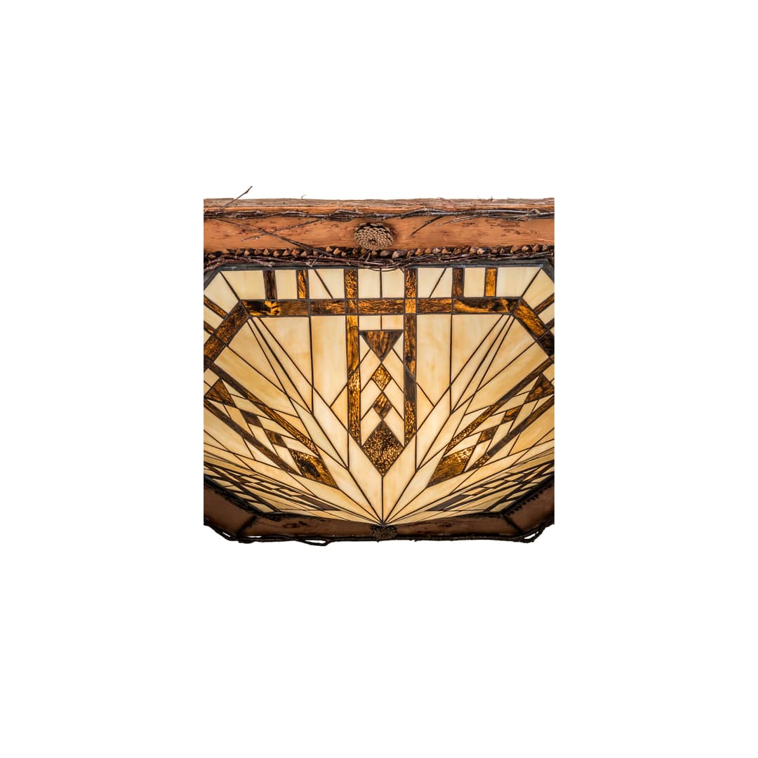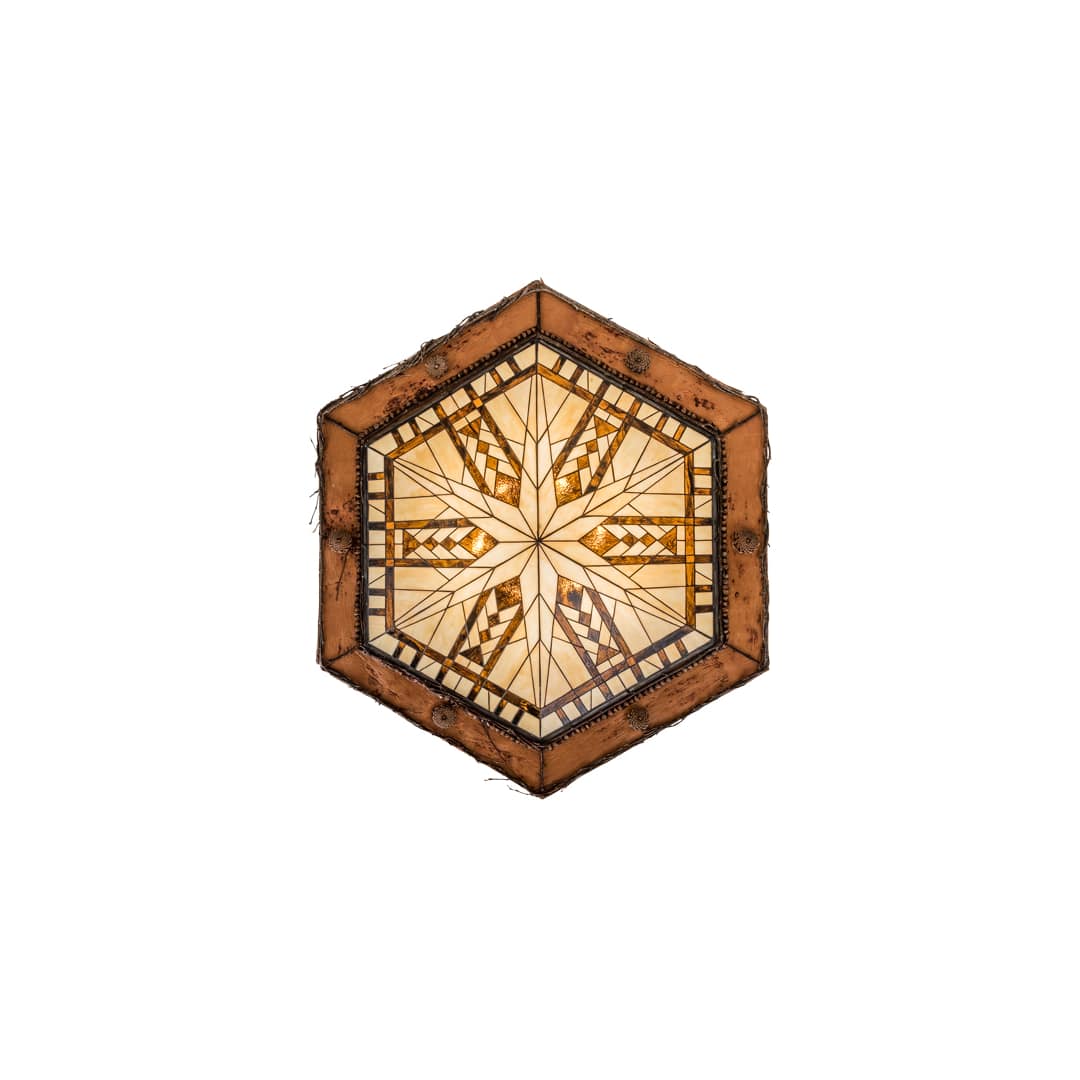 Enchanting southwestern styling and an intriguing Native American design reveal the magic and mystery of tribal symbols in stunning art glass and matching hardware. The hexagonal lighting fixture shade features Sand Beige and Bark Brown granite glass shade which is surrounded by a handmade natural wood medallion. The hardware is finished in a warm Vintage Copper powder coat finish. Handcrafted by highly skilled artisans in our 180,000 square foot manufacturing facility in Upstate NY. Custom styles, colors, and sizes available, as well as dimmable energy efficient lamping options.