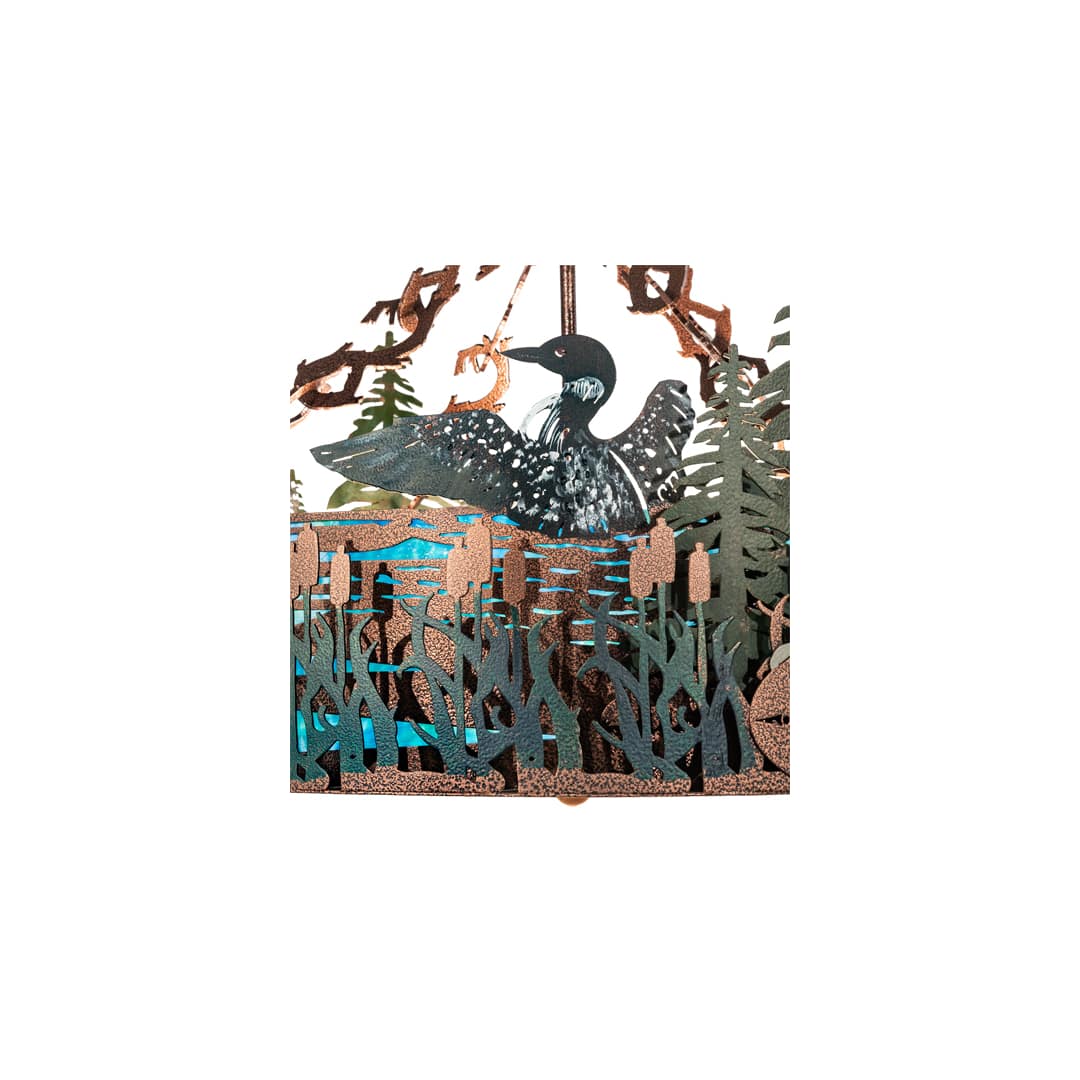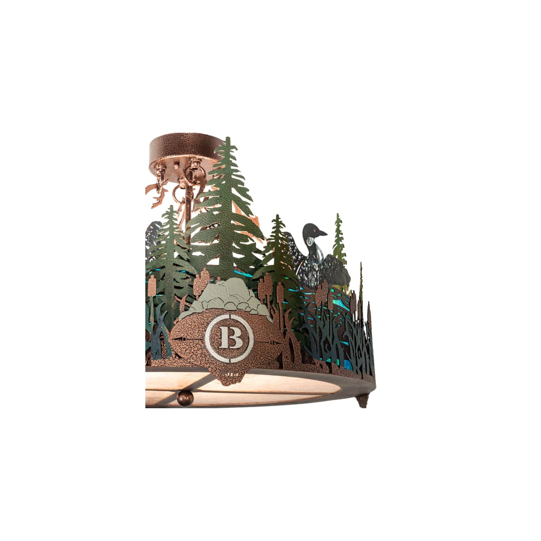 Hand-painted finishes create a stunning effect as Black Loons splash among Wheat colored Cattails and Green Pine Trees. The Blue/Green Art Glass lens is enhanced with a Silver Mica bottom diffuser. The shade is complemented with hardware in a New Copper Vein finish. This ceiling fixture is personalized with the laser-cut Black hand-painted logo for The Boulders in Cooperstown, NY. Handcrafted in our 180,000 square foot manufacturing facility in Yorkville, NY at the foothills of the Adirondack Mountains. This personalized item is an example of our craftsmanship and custom capabilities. It is not for sale as is but can be customized with a business or family name to fit your personal needs.