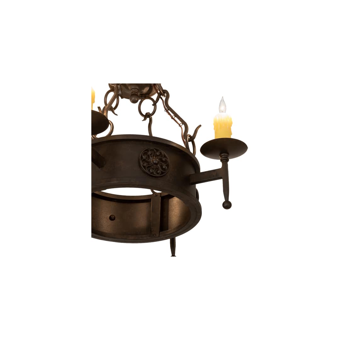 Lorenzo combines a rich charm and artistic look in this elegant lighting design. Floral medallions accentuate this stunning ceiling fixture, which is adorned with 4 exquisite Ivory faux candlelights perched on bobeches with long ballpoint stems. The fixture is enhanced with sturdy, hand forged hardware and a scrolled finial featured in a handsome Chestnut finish. The fixture is ideal for entryways, dining areas, lobbies and other rooms in a variety of residential and commercial settings. Handmade by highly skilled artisans in our 180,000 square foot manufacturing facility in Yorkville, New York. Custom sizes and finishes available.