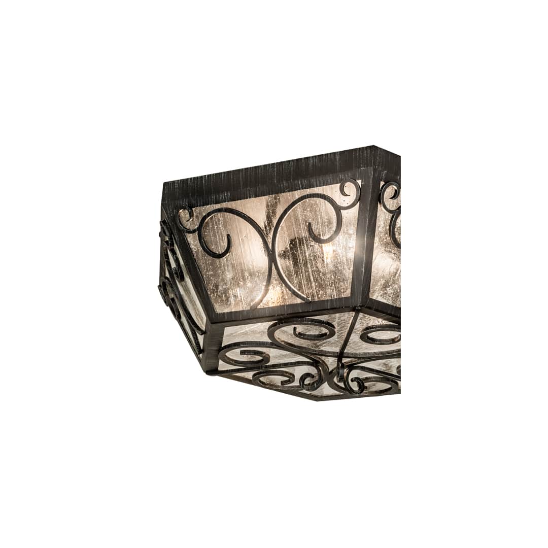 Defined by an exquisite Hand-Forged Iron scrolled design on all sides and bottom panel of this hexagon shaped ceiling fixture. Camilla features a Clear Seeded Glass lens which is complemented with an Antique Iron Gate finish. Handcrafted by highly skilled artisans in our 180,000 square foot manufacturing facility in Yorkville, New York. Diffuser colors, metal finishes and fixture sizes can be customized to your needs.