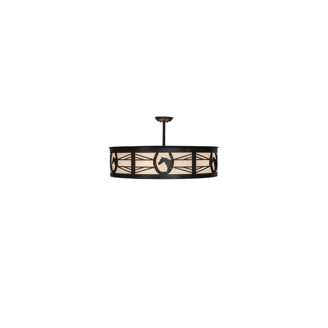 A horse portrait framed with a lucky horseshoe encircles this handsome ceiling fixture. Beautiful ambient light projects through stunning Statuario Idalight accented by a geometric design styled after fencing commonly found at horse stables. Decorative hardware, frame and accents are enhanced in a Timeless Bronze finish. Perfect for game rooms, man caves, equestrian centers and other residential and commercial spaces. Handcrafted by highly skilled artisans in the USA. Custom sizes, styles and colors are available. Energy efficient lamping options such as LED are offered.