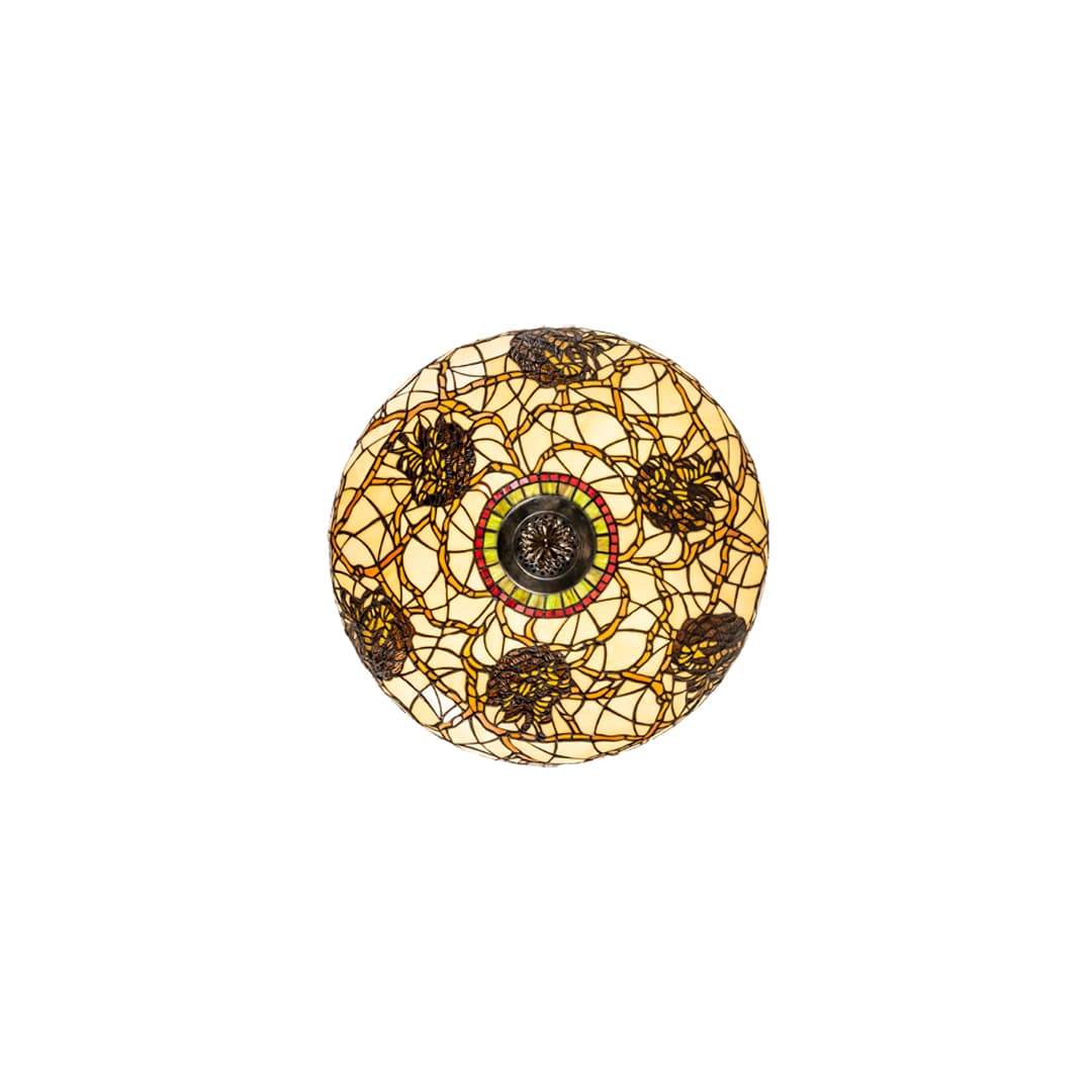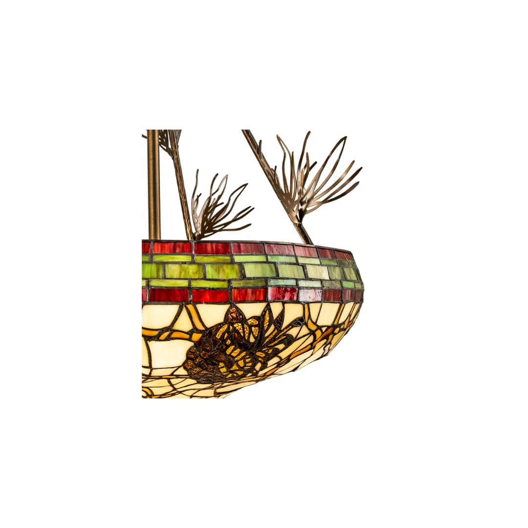 This stunning lighting design features the iconic Pinecone which represents natural elegance and the evolution of human enlightenment. Burgundy and Leaf Green bands edge this woodland art glass shade that highlights Bark Brown Wispy Pinecones and Pine Branches on a Golden Sun background. Burgundy and Green/Brown bands round out this fixture. Antique Copper finished hardware is enhanced with Pine Needle metal accents and finial. The shade is created using the famous Meyda Tiffany copperfoil construction process. Each shade is a unique work of art with color variations based on natural ingredients inherent in the glass.