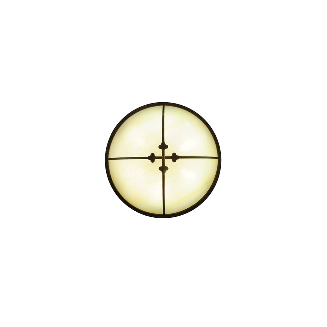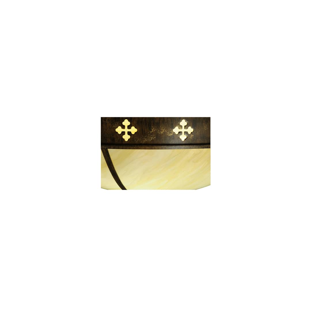 Stylized Byzantine Cross insignias adorn the sturdy border of this classic ceiling fixture. This luxurious shade is handcrafted of Sahara Taupe Idalight, graced and complemented with Brushed Gold finished hardware to blend with nearly any interior decor. The fixture illuminates with 6 customer supplied 26-watt T4 Fluorescent Lamps and operates on a 277-volt system. This flushmount is perfect as the centerpiece for living spaces, foyers, conference rooms, lobbies and other spaces. Handmade by highly skilled artisans in the USA. Custom sizes, designs, finishes and dimmable energy efficient lamping options such as LED are available. UL and CUL listed dry and damp locations.