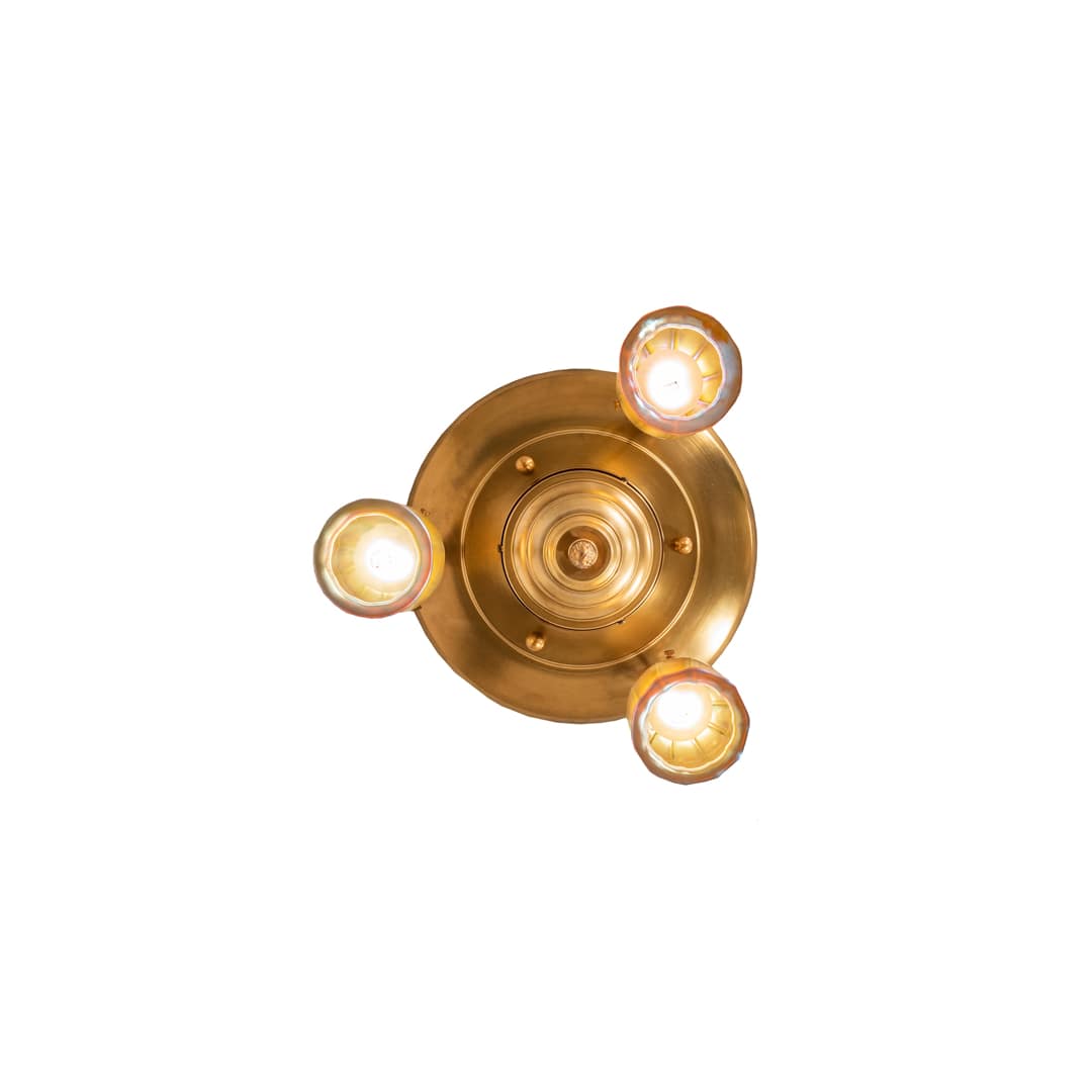 Recreating Tiffany's famous Favrile Lily design from the early 1900s... This Brass ceiling fixture is created with three mouth blown shades featuring Gold Iridescent Glass. The Squash Blossom styled shades are embraced by elegant cast hardware featuring a Brushed Brass finish. The Revival Favrile 3 Light Flushmount is featured in our American made, American designed, handcrafted Favrile Lighting Collection. Manufactured in Yorkville, NY. Each shade is a unique work of art with color variations based on natural ingredients inherent in the glass.