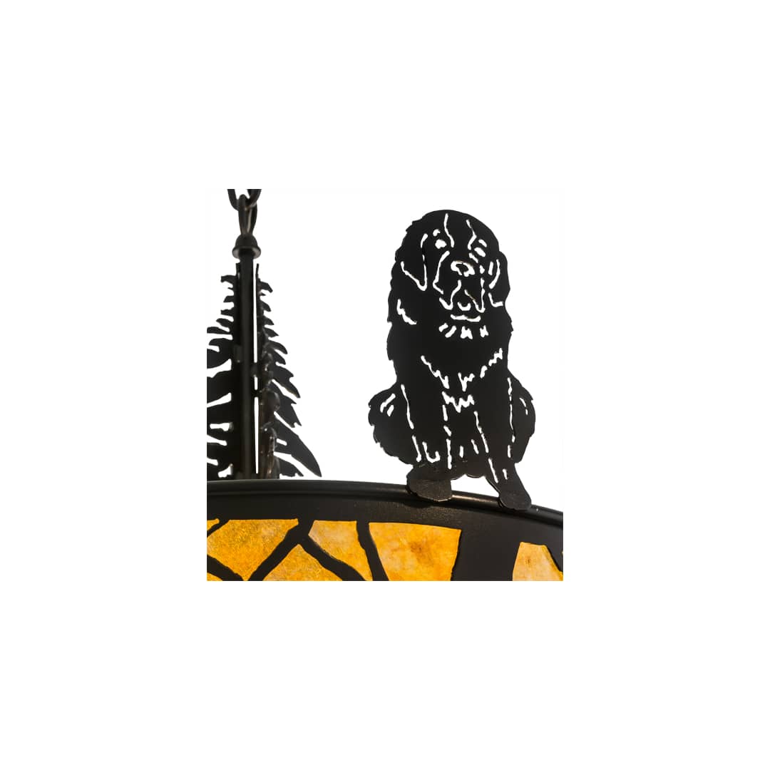 A unique decorative look features canine charm with an elegant luster as Grand Pyrenees, Newfoundland and St. Bernard dogs stand around a Pine Tree and crown this custom chandelier. Textured Black finished Branches highlight an Amber Mica shade, which is accented with five Ivory faux candlelights which grace the shade with curved arms to deliver warm ambient lighting in a lobby, living space or any room where you wish to make a distinctive design statement. Handcrafted in the Meyda facility in Yorkville, New York, this fixture is available in custom sizes, styles and colors, as well as dimmable energy efficient lamping.