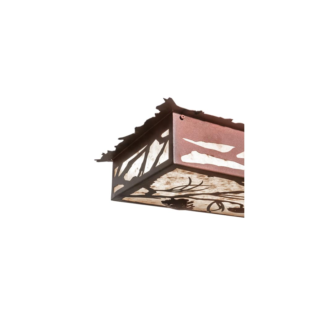 Listen closely. You can almost hear the soft whisper of the Pine branches as they dance in the wind. Enjoy the warm ambiance of soft beautiful light projected through the Silver Mica diffuser featuring stunning Pinecone and Pine branch designs in a unique low profile and oblong shape. Hand finished in handsome Rust Wrought Iron and handcrafted by highly skilled Artisans in Yorkville, New York. Create the design, colors, and the size and style of your choice. Energy efficient lamping options available.