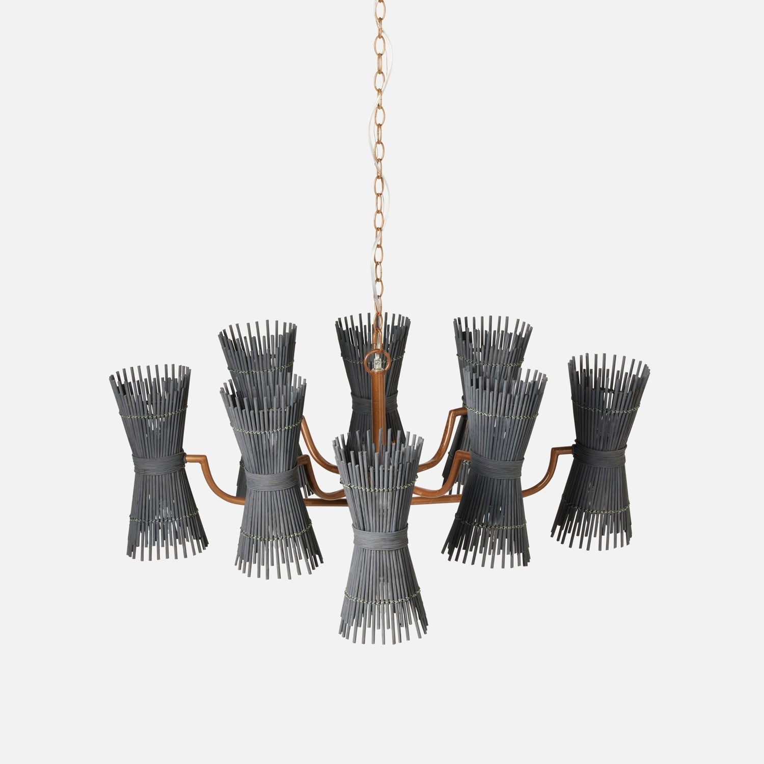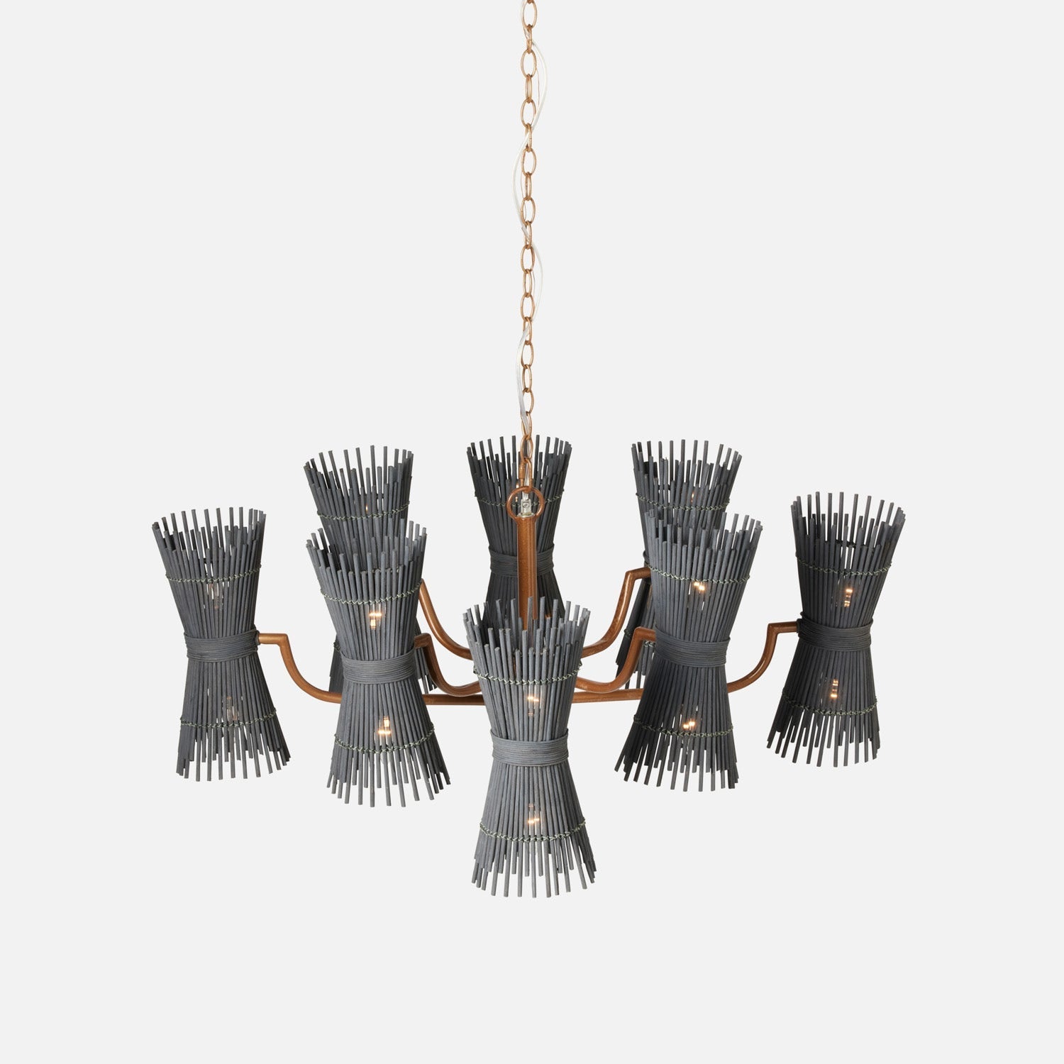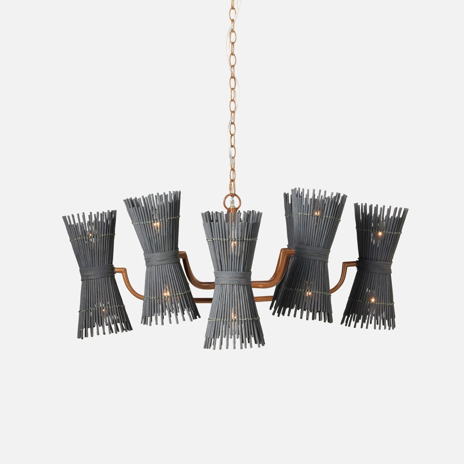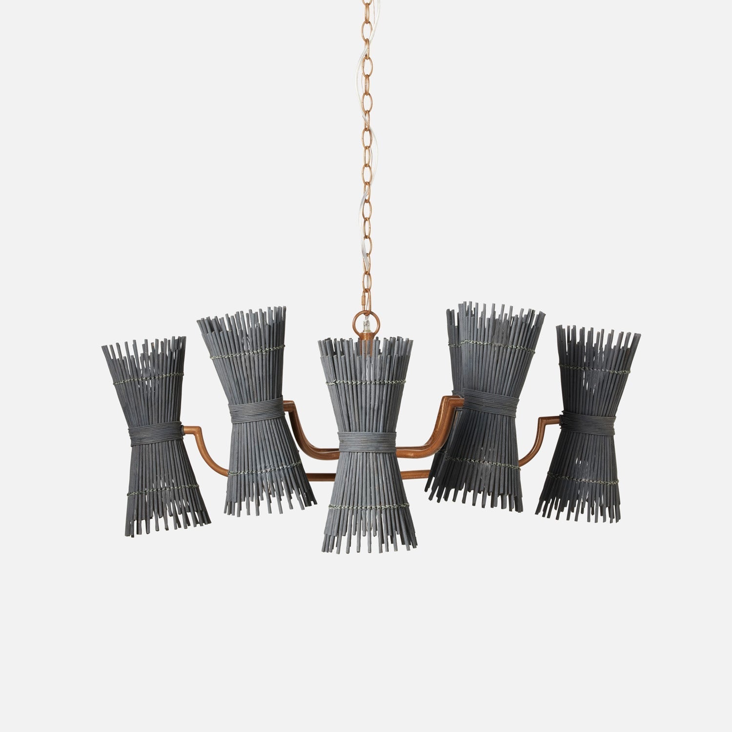 - With cinched shades handcrafted from spindles of natural rattan, the Miko chandelier is a natural take on a mid-century modern classic.