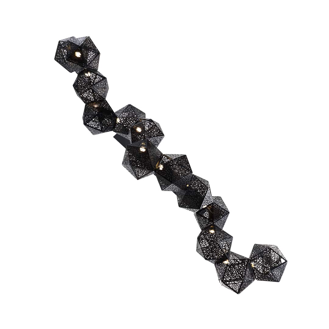 Riddle��s intricate pattern and joinery is no joke. Our expert craftsmen use a special wet-etching process to create a textural motif that looks like a mash up of Sol Lewitt and the complex geometric shapes of Islamic architecture. Inside, an acrylic diffuser shields the high- performance LED modules to create a glare-free illumination, which peekaboo's through the etchings and creates stunning patterns on the nearest surface. A true statement piece with a bold black finish.