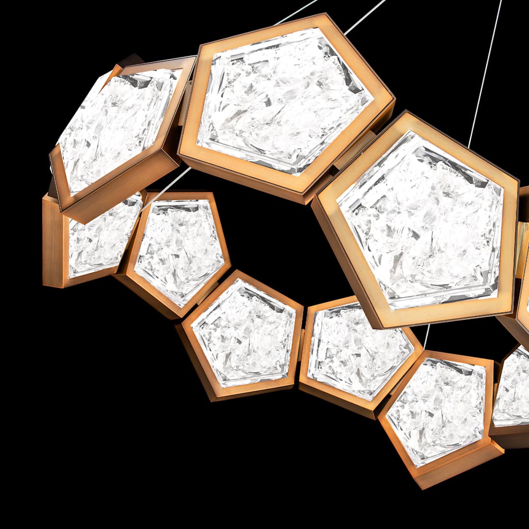 A sculpture of interlocking panels render a thought-provoking aesthetic. The subtle ambient illumination draws attention to this floating work of modern art. Breathtaking geometric arrangements of reclaimed crystal shards provide a visual treat.